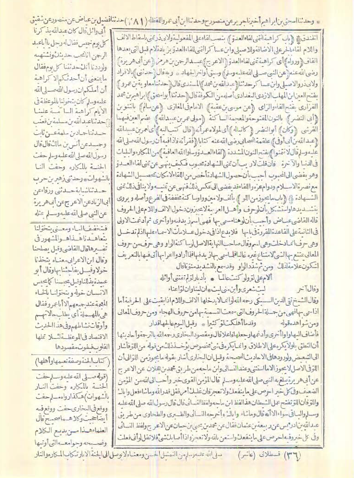 وبه قال: (حدّثنا) بالإفراد ولأبي ذر والأصيلي وابن عساكر: حدّثنا (عبد الله بن محمد) المسندي قال: (حدّثنا معاوية بن عمرو) بفتح العين ابن المهلب الأزدي البغدادي أصله من الكوفة قال: (حدّثنا أبو إسحاق) إبراهيم بن محمد الفزاري بفتح الفاء والزاي (عن موسى بن عقبة) الإمام في المغازي (عن سالم) بالتنوين (أبي النضر) بالنون المفتوحة والمعجمة الساكنة (مولى عمر بن عبيد الله) بضم العين فيهما القرشي (وكان) أبو النضر (كاتبًا له) أي لمولاه عمر أنه (قال: كتب إليه) أي لعمر بن عبيد الله (عبد الله بن أبي أوفى) علقمة الصحابيّ -رضي الله عنه- كتابًا (فقرأته فإذا فيه أن رسول الله -صَلَّى اللَّهُ عَلَيْهِ وَسَلَّمَ- قال):