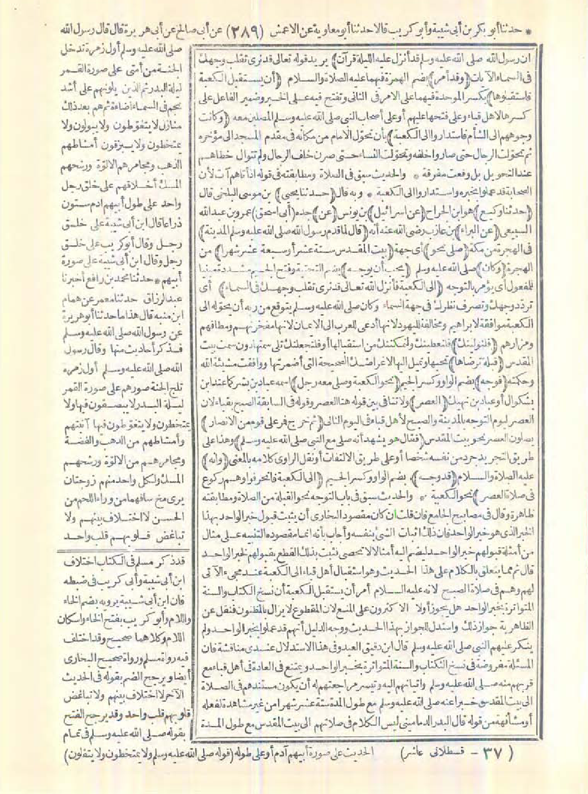 7252 - حَدَّثَنَا يَحْيَى، حَدَّثَنَا وَكِيعٌ، عَنْ إِسْرَائِيلَ، عَنْ أَبِى إِسْحَاقَ، عَنِ الْبَرَاءِ قَالَ: لَمَّا قَدِمَ رَسُولُ اللَّهِ -صَلَّى اللَّهُ عَلَيْهِ وَسَلَّمَ- الْمَدِينَةَ صَلَّى نَحْوَ بَيْتِ الْمَقْدِسِ سِتَّةَ عَشَرَ أَوْ سَبْعَةَ عَشَرَ شَهْرًا، وَكَانَ يُحِبُّ أَنْ يُوَجَّهَ إِلَى الْكَعْبَةِ، فَأَنْزَلَ اللَّهُ تَعَالَى: {قَدْ نَرَى تَقَلُّبَ وَجْهِكَ فِى السَّمَاءِ فَلَنُوَلِّيَنَّكَ قِبْلَةً تَرْضَاهَا} [البقرة: 144] فَوُجِّهَ نَحْوَ الْكَعْبَةِ وَصَلَّى مَعَهُ رَجُلٌ الْعَصْرَ، ثُمَّ خَرَجَ فَمَرَّ عَلَى قَوْمٍ مِنَ الأَنْصَارِ فَقَالَ: هُوَ يَشْهَدُ أَنَّهُ صَلَّى مَعَ النَّبِيِّ -صَلَّى اللَّهُ عَلَيْهِ وَسَلَّمَ- وَأَنَّهُ قَدْ وُجِّهَ إِلَى الْكَعْبَةِ فَانْحَرَفُوا وَهُمْ رُكُوعٌ فِى صَلاَةِ الْعَصْرِ.