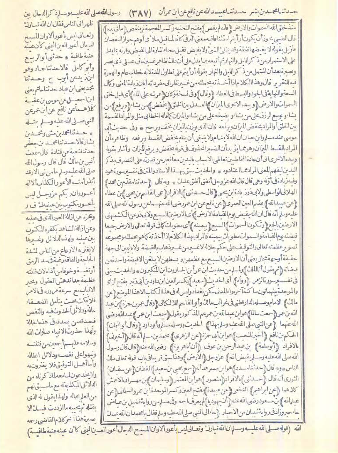 7414 - حَدَّثَنَا مُسَدَّدٌ، سَمِعَ يَحْيَى بْنَ سَعِيدٍ، عَنْ سُفْيَانَ حَدَّثَنِى مَنْصُورٌ وَسُلَيْمَانُ عَنْ إِبْرَاهِيمَ، عَنْ عَبِيدَةَ، عَنْ عَبْدِ اللَّهِ أَنَّ يَهُودِيًّا جَاءَ إِلَى النَّبِيِّ -صَلَّى اللَّهُ عَلَيْهِ وَسَلَّمَ- فَقَالَ: يَا مُحَمَّدُ إِنَّ اللَّهَ يُمْسِكُ السَّمَوَاتِ عَلَى إِصْبَعٍ، وَالأَرَضِينَ عَلَى إِصْبَعٍ وَالْجِبَالَ عَلَى إِصْبَعٍ وَالشَّجَرَ عَلَى إِصْبَعٍ وَالْخَلاَئِقَ عَلَى إِصْبَعٍ، ثُمَّ يَقُولُ: أَنَا الْمَلِكُ، فَضَحِكَ رَسُولُ اللَّهِ -صَلَّى اللَّهُ عَلَيْهِ وَسَلَّمَ- حَتَّى بَدَتْ نَوَاجِذُهُ ثُمَّ قَرَأَ: {وَمَا قَدَرُوا اللَّهَ حَقَّ قَدْرِهِ} [الأنعام: 91].