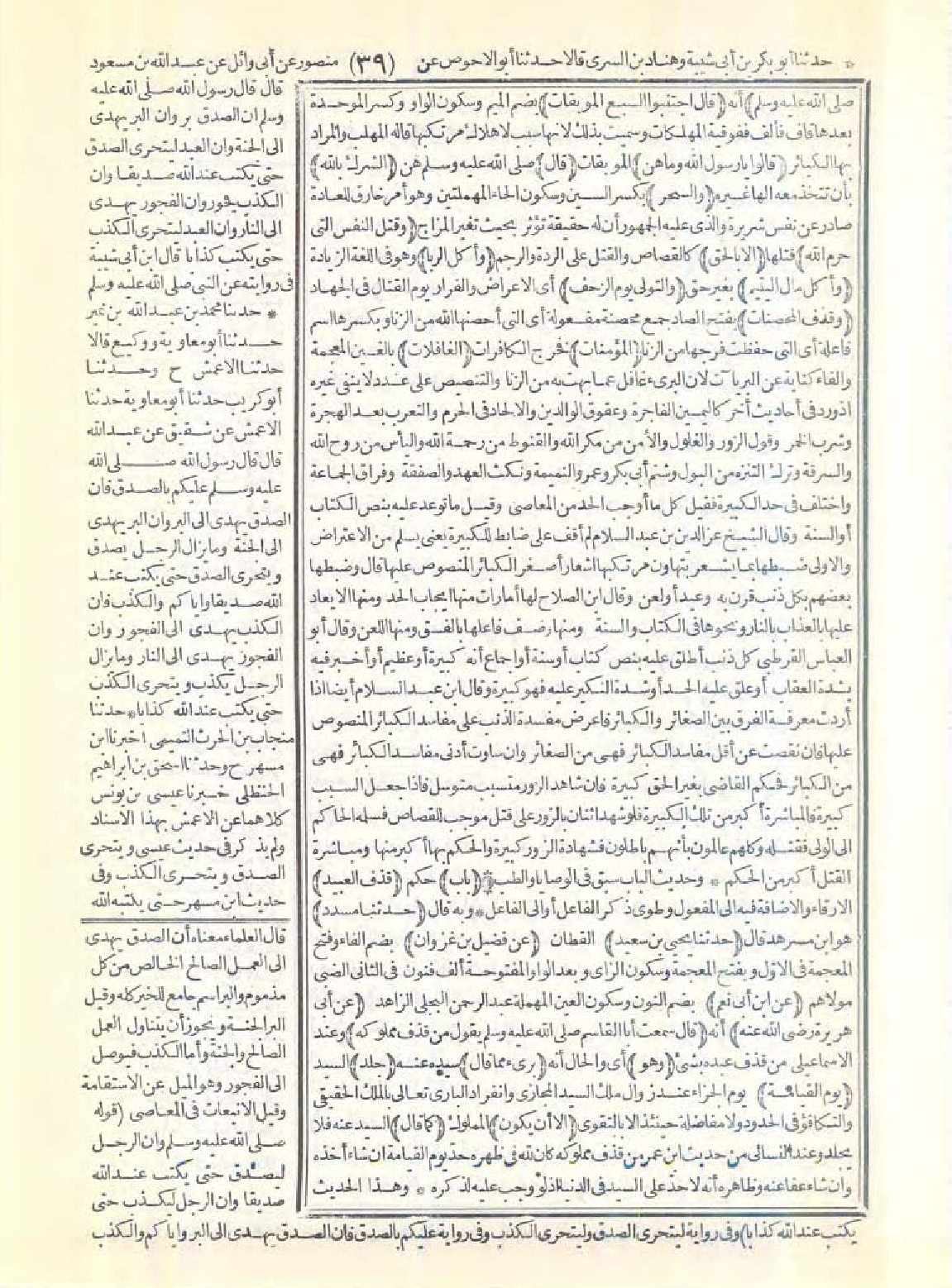 وعقوق الوالدين والإلحاد في المحرم والتعرب بعد الهجرة وشرب الخمر وقول الزور والغلول والأمن من مكر الله والقنوط من رحمة الله واليأس من روح الله والسرقة وترك التنزه. من البول وشتم أبي بكر وعمر والنميمة ونكث العهد والصفقة وفراق الجماعة.
