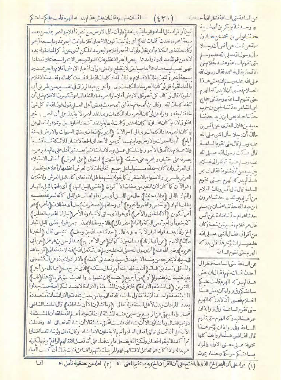 وأخرج عبد الرزاق في تفسيره من طريق أبي الجوزاء قال: لو كان كل شجرة في الأرض أقلامًا والبحر مدادًا لنفد الماء وتكسرت الأقلام قبل أن تنفد كلمات الله. وقال ابن أبي حاتم: حدّثني أبي سمعت بعض أهل العلم يقول قول الله: {إنّا كل شيء خلقناه بقدر} [القمر: 49] وقوله: {قل لو كان البحر مدادًا لكلمات ربي لنفد البحر} الآية يدل على أن البحر غير مخلوق لأنه لو كان مخلوقًا لكان له قدر وكانت له غاية ولنفد كنفاد المخلوقين وتلا قوله تعالى: {قل لو كان البحر مدادًا لكلمات ربي} إلى آخر الآية. ({إن ربكم الله الذي خلق السماوات والأرض في ستة أيام}) أراد السماوات والأرض وما بينهما أي من الأحد إلى الجمعة لاعتبار الملائكة شيئًا فشيئًا وللإعلام بالتأني في الأمور وإن لكل عمل يومًا لأن إنشاء شيء بعد شيء أدل على عالم مدبر مريد يصرفه على اختياره ويجريه على مشيئته ({ثم استوى}) استولى ({على العرش}) أضاف الاستيلاء إلى العرش وإن كان سبحانه مستوليًا على جميع المخلوقات لأن العرش أعظمها وأعلاها وتفسير العرش بالسرير والاستواء بالاستقرار كما يقوله المشبهة باطل لأنه تعالى كان قبل العرش ولا مكان وهو الآن كما كان لأن التغير من صفات الأكوان ({يغشي الليل النهار}) أي يلحق الليل بالنهار والنهار بالليل ({يطلبه حثيثًا}) حال من الليل أي سريعًا والطالب هو الليل كأنه لسرعة مضيه يطلب النهار ({والشمس والقمر والنجوم}) أي وخلقها ({مسخرات}) حال أي مذللات ({بأمره}) هو أمر تكوين ({ألا له الخلق والأمر}) أي هو الذي خلق الأشياء وله الأمر ({تبارك الله رب العالمين} [الأعراف: 54]) كثر خيره أو دام برّه من البركة والنماء (سخر: ذلل). باللام وسقط لأبي ذر من قوله: {يغشي الليل النهار} الخ وقال بعد قوله: {النهار} الآية.