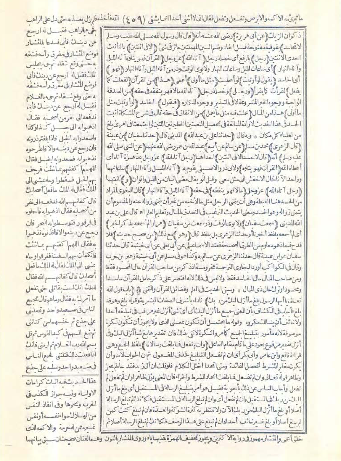 7529 - حَدَّثَنَا عَلِىُّ بْنُ عَبْدِ اللَّهِ، حَدَّثَنَا سُفْيَانُ قَالَ الزُّهْرِىُّ: عَنْ سَالِمٍ عَنْ أَبِيهِ عَنِ النَّبِيِّ -صَلَّى اللَّهُ عَلَيْهِ وَسَلَّمَ- قَالَ: «لاَ حَسَدَ إِلاَّ فِى اثْنَتَيْنِ: رَجُلٌ آتَاهُ اللَّهُ الْقُرْآنَ فَهْوَ يَتْلُوهُ آنَاءَ اللَّيْلِ وَآنَاءَ النَّهَارِ،