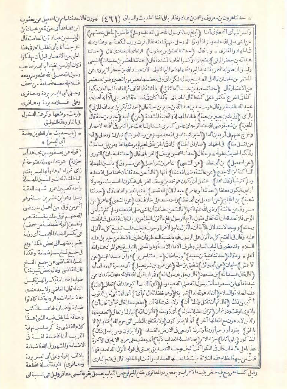 وبه قال: (حدّثنا الفضل بن يعقوب) الرخامي البغدادي قال: حدّثنا عبد الله بن جعفر الرقي) بفتح الراء وكسر القاف المشددة قال: (حدّثنا المعتمر بن سليمان) التيمي وقيل إن صوابه المعمر بتشديد الميم وفتحها وضم الميم الأولى لأن عبد الله بن جعفر لا يروي عن المعتمر بن سليمان قاله في المصابيح. وقال الكرماني: وفي بعضها معمر من التعمير وصوابه معتمر من الاعتمار قال: (حدّثنا سعيد بن عبد الله الثقفي) بالمثلثة ثم القاف ثم الفاء بفتح العين مكبرًا كذا في الفرع مكتوبًا على كشط. قال الجياني: وذا كان في نسخة الأصيلي إلا أنه أصلحه عبيد الله بالتصغير وقال هو سعيد بن عبد الله بن جبير بن حية قال: (حدّثنا بكر بن عبد الله المزني) بالزاي (وزياد بن جبير بن حية) بالحاء المهملة والتحتية المشددة (عن) أبيه (جبير بن حية قال المغيرة) بن شعبة -رضي الله عنه- لترجمان عامل كسرى بندار لما بعث عمر الناس في أفناء الأمصار وخرج عليهم في أربعين ألفًا (أخبرنا نبينا -صَلَّى اللَّهُ عَلَيْهِ وَسَلَّمَ- عن رسالة ربنا) تبارك وتعالى: