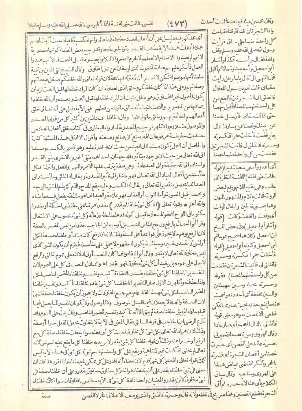 وقال الحافظ عماد الدين بن كثير كل من قولي المصدر والموصول متلازم والأظهر ترجيح المصدرية لما رواه البخاري في كتاب خلق أفعال العباد من حديث حذيفة مرفوعًا: إن الله يصنع كل صانع وصنعته وأقوال الأئمة في هذه المسألة كثيرة، والحاصل أن العمل يكون مسند إلى العبد من حيث إن له قدرة عليه وهو المسمى بالكسب ومسندًا إلى الله تعالى من حيث إن وجودهُ بتأثيره فله جهتان بإحداهما ينفي الجبر وبالأخرى ينفي القدر وإسناده إلى الله حقيقة وإلى العبد عادة وهي صفة يترتب عليها الأمر والنهي والفعل والترك فكل ما أسند من أفعال العباد إلى الله تعالى فهو بالنظر إلى تأثير القدرة ويقال له الخلق وما أسند إلى العبد إنما يحصل بتقدير الله تعالى، ويقال له الكسب وعليه يقع المدح والذم كما يذم المشوّه الوجه ويحمد الجميل الصورة، وأما الثواب أو العقاب فهو علامة والعبد إنما هو ملك لله يفعل فيه ما يشاء والله أعلم.
