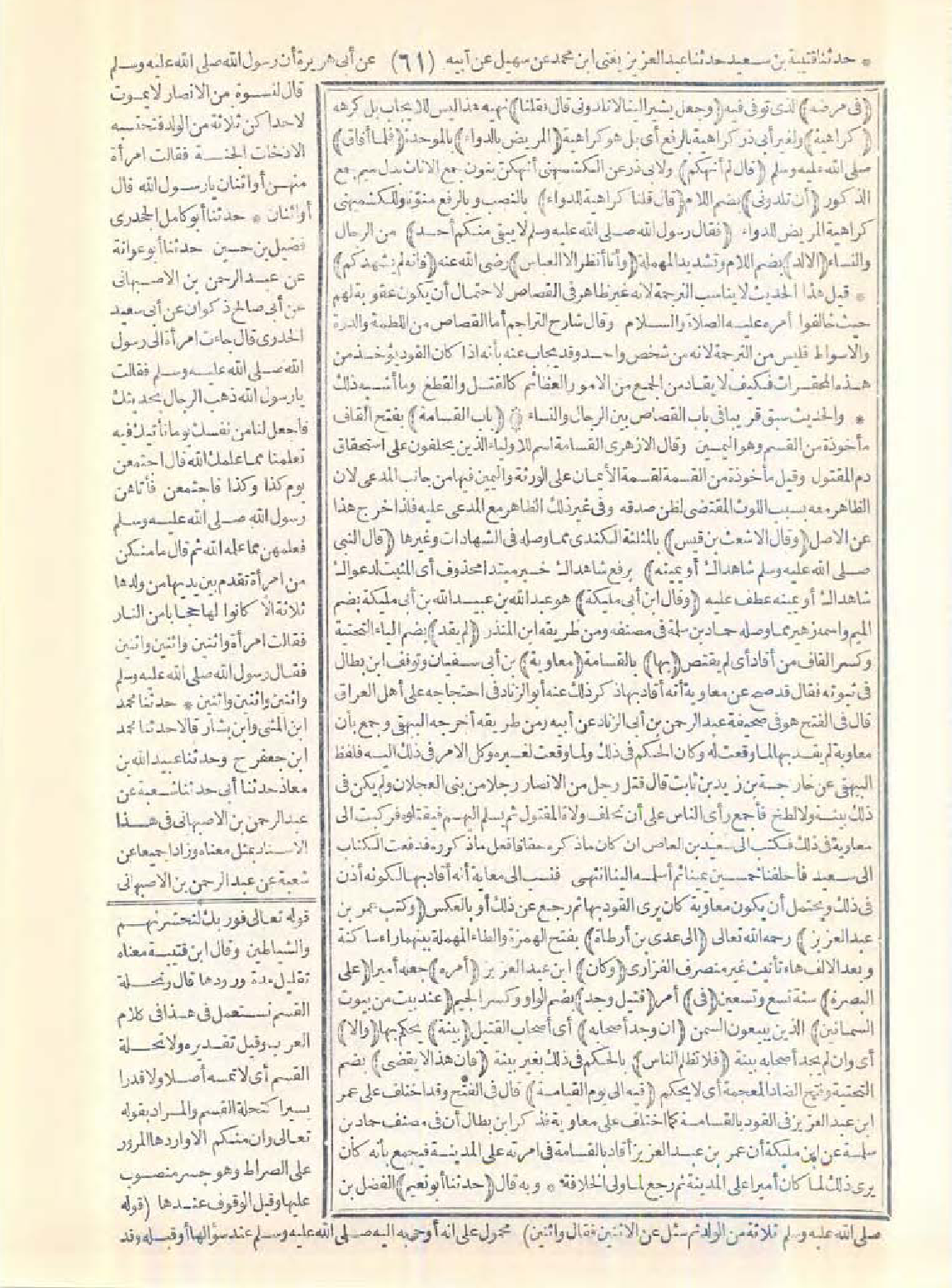 (وكتب عمر بن عبد العزيز) -رحمه الله تعالى- (إلى عديّ بن أرطأة) بفتح الهمزة والطاء المهملة بينهما راء ساكنة وبعد الألف هاء تأنيث غير منصرف الفزاريّ (وكان) ابن عبد العزيز (أمّره) جعله أميرًا (على البصرة) سنة تسع وتسعين (في) أمر (قتيل وجد) بضم الواو وكسر الجيم (عند بيت من بيوت السمانين) الذين يبيعون السمن (إن وجد أصحابه) أي أصحاب القتيل (بيّنة) يحكم بها (وإلاّ) أي وإن لم يجد أصحابه بيّنة (فلا تظلم الناس) بالحكم في ذلك بغير بيّنة (فإن هذا لا يفضي) بضم التحية وفتح الضاد المعجمة أي لا يحكم (فيه إلى يوم القيامة) قال في الفتح: وقد اختلف على عمر بن عبد العزيز في القود بالقسامة كما اختلف على معاوية فذكر ابن بطال أن في مصنف حماد بن سلمة عن ابن أبي مليكة أن عمر بن عبد العزيز أقاد بالقسامة في إمرته على المدينة فيجمع بأنه وإن يرى ذلك لما كان أميرًا على المدينة ثم رجع لما ولي الخلافة.