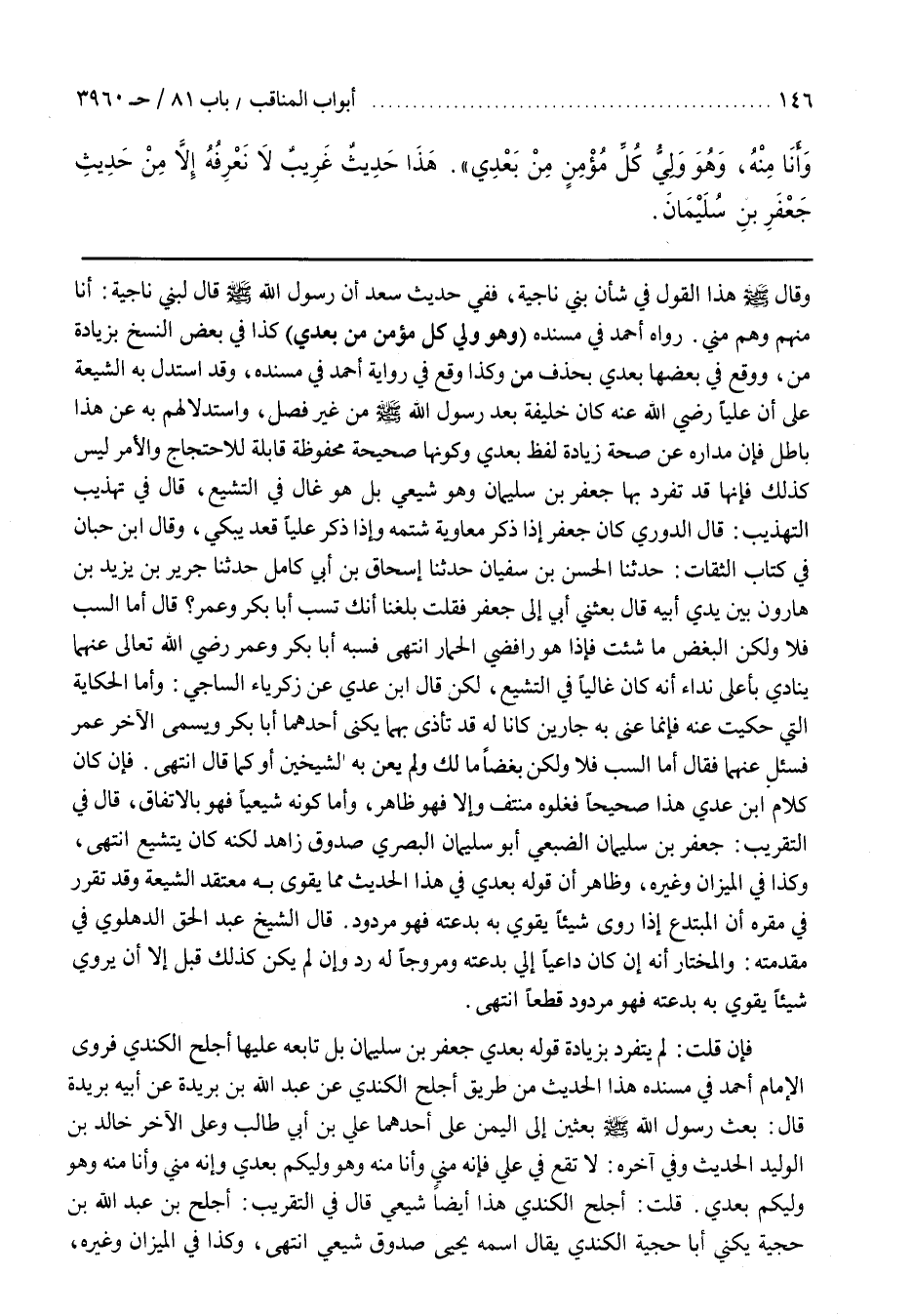 فإن كان كلام بن عَدِيٍّ هَذَا صَحِيحًا فَغُلُوُّهُ مُنْتَفٍ وَإِلَّا فَهُوَ ظَاهِرٌ وَأَمَّا كَوْنُهُ شِيعِيًّا فَهُوَ بِالِاتِّفَاقِ قَالَ فِي التَّقْرِيبِ جَعْفَرُ بْنُ سُلَيْمَانَ الضُّبَعِيُّ أَبُو سُلَيْمَانَ الْبَصْرِيُّ صَدُوقٌ زَاهِدٌ لَكِنَّهُ كَانَ يَتَشَيَّعُ انْتَهَى وَكَذَا فِي الْمِيزَانِ وَغَيْرِهِ وَظَاهِرٌ أَنَّ قَوْلَهُ بَعْدِي فِي هَذَا الْحَدِيثِ مِمَّا يَقْوَى به معتقدا الشِّيعَةِ وَقَدْ تَقَرَّرَ فِي مَقَرِّهِ أَنَّ الْمُبْتَدِعَ إِذَا رَوَى شَيْئًا يُقَوِّي بِهِ بِدْعَتَهُ فَهُوَ مَرْدُودٌ