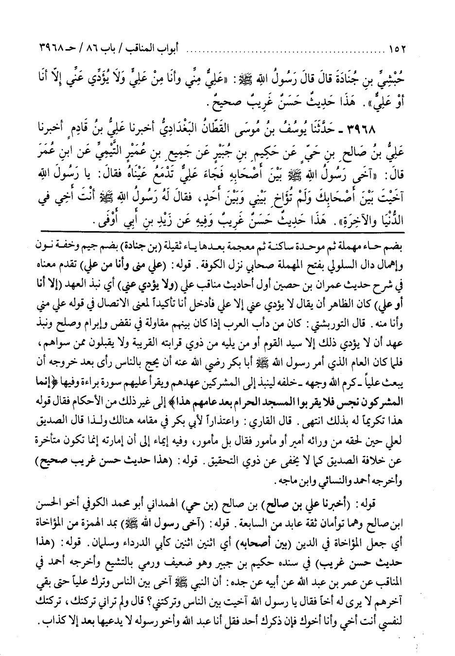قَوْلُهُ (هَذَا حَدِيثٌ حَسَنٌ غَرِيبٌ) فِي سَنَدِهِ حَكِيمُ بْنُ جُبَيْرٍ وَهُوَ ضَعِيفٌ وَرُمِيَ بِالتَّشَيُّعِ وَأَخْرَجَهُ أَحْمَدُ فِي الْمَنَاقِبِ عَنْ عُمَرَ بْنِ عَبْدِ اللَّهِ عَنْ أَبِيهِ عَنْ جَدِّهِ أَنَّ النَّبِيَّ صَلَّى اللَّهُ عَلَيْهِ وَسَلَّمَ آخَى بَيْنَ النَّاسِ وَتَرَكَ عَلِيًّا حَتَّى بَقِيَ آخِرَهُمْ لَا يَرَى لَهُ أَخًا فَقَالَ يَا رَسُولَ اللَّهِ آخَيْتَ بَيْنَ النَّاسِ وَتَرَكْتَنِي قَالَ وَلِمَ تَرَانِي تَرَكْتُكَ تَرَكْتُكَ لِنَفْسِي أَنْتَ أَخِي وَأَنَا أَخُوكَ فَإِنْ ذَكَرَكَ أَحَدٌ فَقُلْ أَنَا عَبْدُ اللَّهِ وَأَخُو رَسُولِهِ لَا يَدَّعِيهَا بَعْدُ إِلَّا كَذَّابٌ