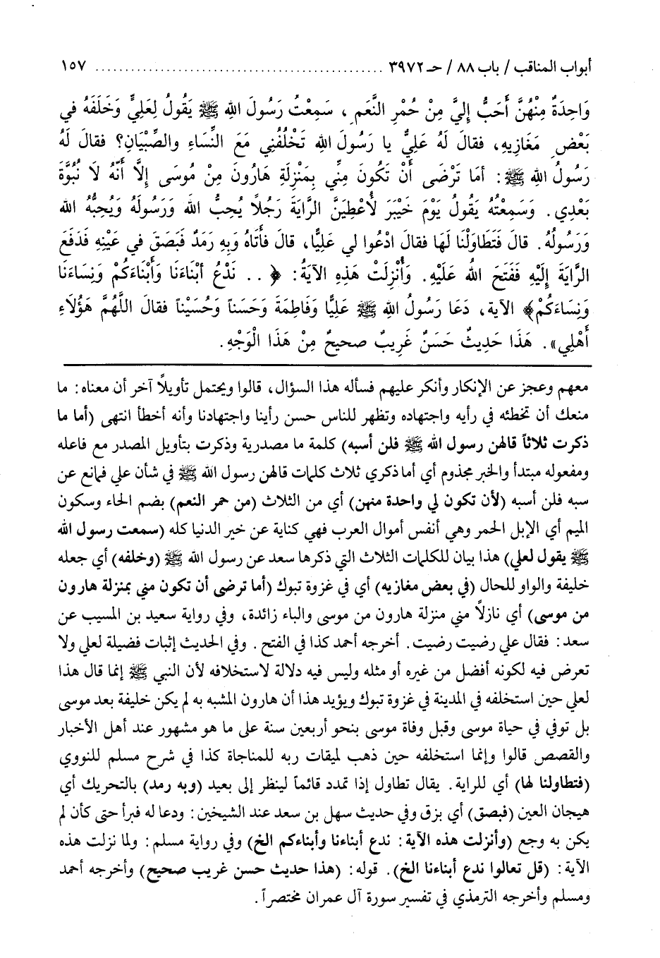 مَعَهُمْ وَعَجَزَ عَنِ الْإِنْكَارِ وَأَنْكَرَ عَلَيْهِمْ فَسَأَلَهُ هَذَا السُّؤَالَ قَالُوا وَيَحْتَمِلُ تَأْوِيلًا آخَرَ أَنَّ معناه ما مَنَعَكَ أَنْ تُخَطِّئَهُ فِي رَأْيِهِ وَاجْتِهَادِهِ وَتُظْهِرَ لِلنَّاسِ حُسْنَ رَأْيِنَا وَاجْتِهَادِنَا وَأَنَّهُ أَخْطَأَ انْتَهَى (أَمَّا مَا ذَكَرْتُ ثَلَاثًا قَالَهُنَّ رَسُولُ اللَّهِ صَلَّى اللَّهُ عَلَيْهِ وَسَلَّمَ فَلَنْ أَسُبَّهُ) كَلِمَةُ مَا مَصْدَرِيَّةٌ وَذُكِرَتْ بِتَأْوِيلِ الْمَصْدَرِ مَعَ فَاعِلِهِ ومفعوله مبتدأ والخبر مجذوف أَيْ أَمَّا ذِكْرِي ثَلَاثَ كَلِمَاتٍ قَالَهُنَّ رَسُولُ اللَّهِ صَلَّى اللَّهُ عَلَيْهِ وَسَلَّمَ فِي شَأْنِ عَلِيٍّ فَمَانِعٌ عَنْ سَبِّهِ فَلَنْ أَسُبَّهُ (لَأَنْ تَكُونَ لِي وَاحِدَةٌ مِنْهُنَّ) أَيْ مِنَ الثَّلَاثِ (مِنْ حُمْرِ النَّعَمِ) بِضَمِّ الْحَاءِ وَسُكُونِ الْمِيمِ أَيِ الْإِبِلِ الْحُمْرِ وَهِيَ أَنْفُسُ أَمْوَالِ الْعَرَبِ فَهِيَ كِنَايَةٌ عَنْ خَيْرِ الدُّنْيَا كُلِّهِ (سَمِعْتُ رَسُولَ اللَّهِ صَلَّى اللَّهُ عَلَيْهِ وَسَلَّمَ يقول لِعَلِيٍّ) هَذَا بَيَانٌ لِلْكَلِمَاتِ الثَّلَاثِ الَّتِي ذَكَرَهَا سَعْدٌ عَنْ رَسُولِ اللَّهِ صَلَّى اللَّهُ عَلَيْهِ وَسَلَّمَ (وَخَلَفَهُ) أَيْ جَعَلَهُ خَلِيفَةً وَالْوَاوُ لِلْحَالِ (فِي بَعْضِ مَغَازِيهِ) أَيْ فِي غَزْوَةِ تَبُوكٍ (أَمَا تَرْضَى أَنْ تَكُونَ مِنِّي بِمَنْزِلَةِ هَارُونَ مِنْ مُوسَى) أَيْ نَازِلًا مِنِّي مَنْزِلَةَ هَارُونَ مِنْ مُوسَى وَالْبَاءُ زَائِدَةٌ وَفِي رِوَايَةِ سَعِيدِ بْنِ الْمُسَيِّبِ عَنْ سَعْدٍ فَقَالَ عَلِيٌّ رَضِيتُ رَضِيتُ