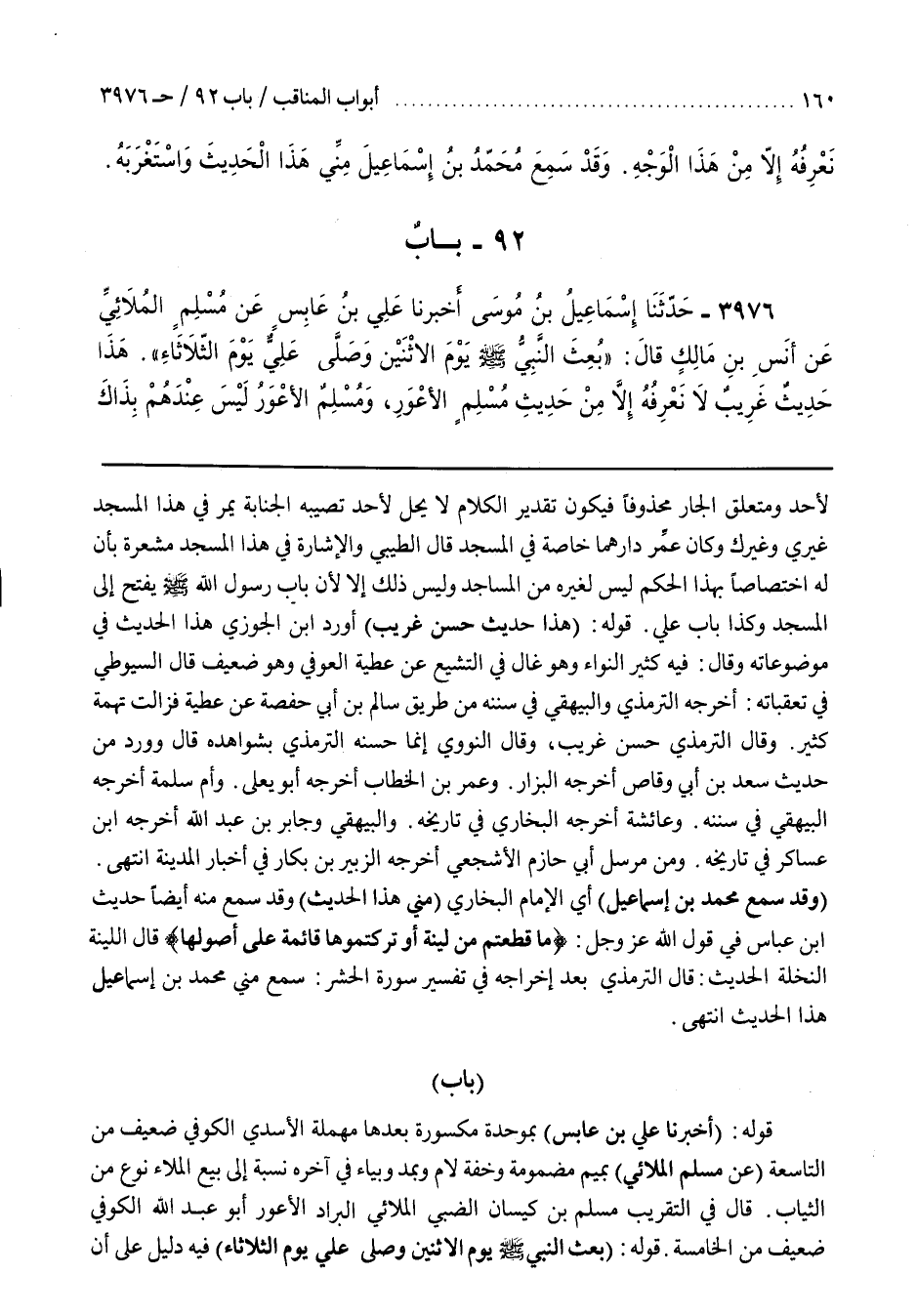 6 - باب [3728] قوله (حدثنا عَلِيُّ بْنُ عَابِسٍ) بِمُوَحَّدَةٍ مَكْسُورَةٍ بَعْدَهَا مُهْمَلَةٌ الْأَسَدِيُّ الْكُوفِيُّ ضَعِيفٌ مِنَ التَّاسِعَةِ (عَنْ مُسْلِمٍ الْمُلَائِيِّ) بِمِيمٍ مَضْمُومَةٍ وَخِفَّةِ لَامٍ وَبِمَدٍّ وَبِيَاءٍ فِي آخِرِهِ نِسْبَةً إِلَى بَيْعِ الْمِلَاءِ نَوْعٍ مِنَ الثِّيَابِ