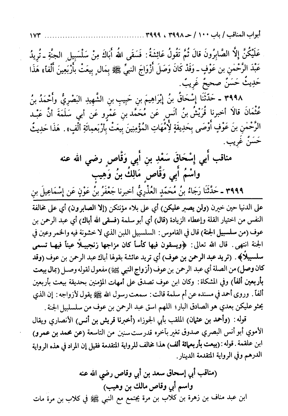 قَالَ اللَّهُ تَعَالَى وَيُسْقَوْنَ فِيهَا كَأْسًا كَانَ مِزَاجُهَا زَنْجَبِيلًا عَيْنًا فِيهَا تُسَمَّى سلسبيلا (تُرِيدُ عَبْدَ الرَّحْمَنِ بْنَ عَوْفٍ) أَيْ تُرِيدُ عَائِشَةُ بِقَوْلِهَا أَبَاكَ عَبْدَ الرَّحْمَنِ بْنَ عَوْفٍ (وَقَدْ كَانَ وَصَلَ) مِنَ الصِّلَةِ أَيْ عَبْدُ الرَّحْمَنِ بْنُ عَوْفٍ (أَزْوَاجَ النَّبِيِّ صَلَّى اللَّهُ عَلَيْهِ وَسَلَّمَ) مَفْعُولٌ لِقَوْلِهِ وَصَلَ (بِمَالٍ بِيعَتْ بأربعين ألفا) وفي المشكاة وكان بن عَوْفٍ تَصَدَّقَ عَلَى أُمَّهَاتِ الْمُؤْمِنِينَ بِحَدِيقَةٍ بِيعَتْ بِأَرْبَعِينَ أَلْفًا