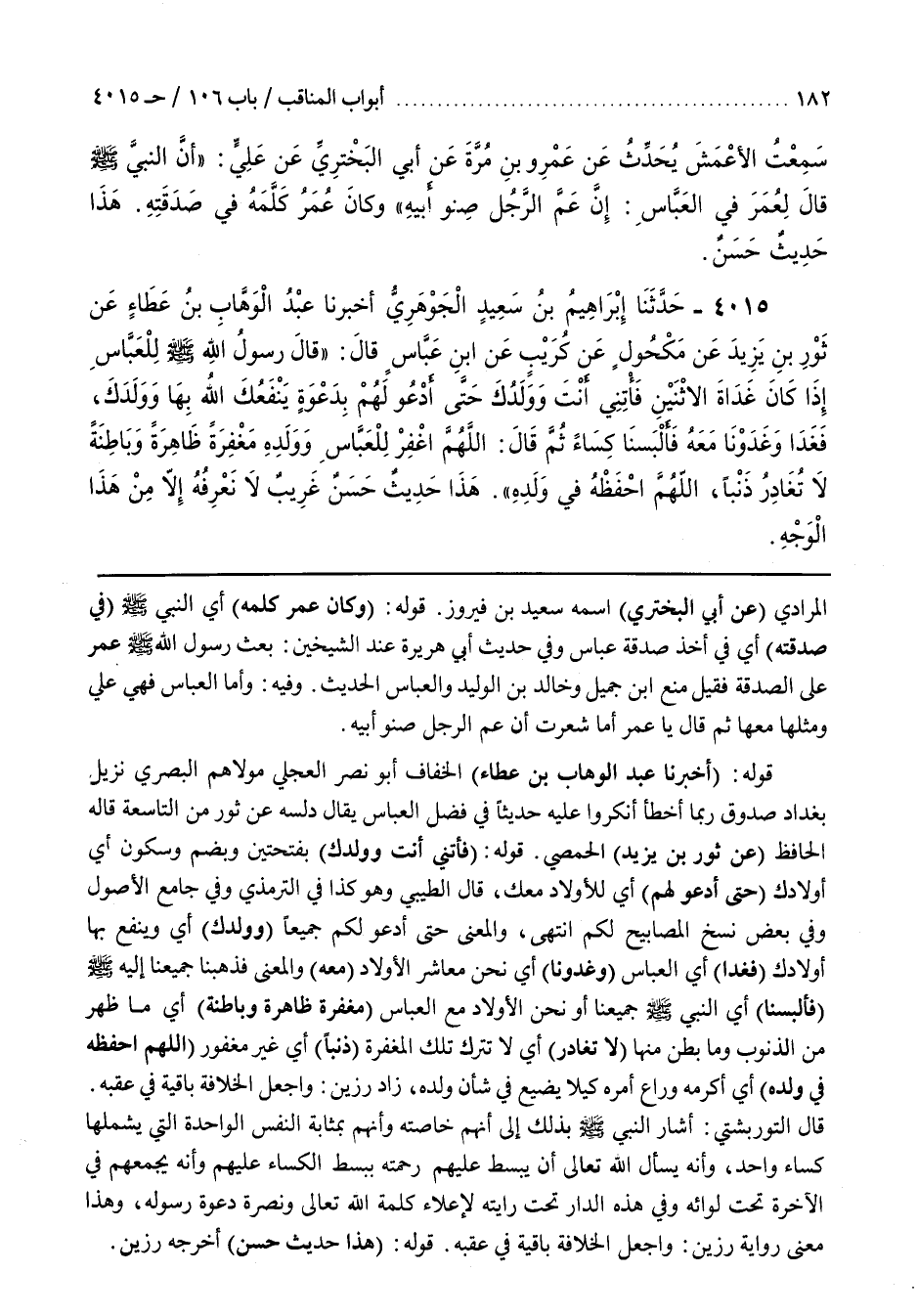 [3762] قَوْلُهُ (أَخْبَرَنَا عَبْدُ الْوَهَّابِ بْنُ عَطَاءٍ) الْخَفَّافُ أَبُو نَصْرٍ الْعِجْلِيُّ مَوْلَاهُمُ الْبَصْرِيُّ نَزِيلُ بَغْدَادَ صَدُوقٌ رُبَّمَا أَخْطَأَ أَنْكَرُوا عَلَيْهِ حَدِيثًا فِي فَضْلِ الْعَبَّاسِ يُقَالُ دَلَّسَهُ عَنْ ثَوْرٍ مِنَ التَّاسِعَةِ قَالَهُ الْحَافِظُ (عَنْ ثَوْرِ بْنِ يَزِيدَ) الْحِمْصِيِّ قَوْلُهُ (فَأْتِنِي أَنْتَ وَوَلَدُكَ) بِفَتْحَتَيْنِ وَبِضَمٍّ وَسُكُونٍ أَيْ أَوْلَادُكَ (حَتَّى أَدْعُوَ لَهُمْ) أَيْ لِلْأَوْلَادِ مَعَكَ قَالَ الطِّيبِيُّ وَهُوَ كَذَا فِي التِّرْمِذِيِّ وَفِي جَامِعِ الْأُصُولِ وَفِي بَعْضِ نُسَخِ الْمَصَابِيحِ لَكُمْ انْتَهَى وَالْمَعْنَى حَتَّى أَدْعُوَ لَكُمْ جَمِيعًا (وَوَلَدَكَ) أَيْ وَيَنْفَعُ بِهَا أَوْلَادَكَ (فَغَدَا) أَيِ الْعَبَّاسُ (وَغَدَوْنَا) أَيْ نَحْنُ مُعَاشِرَ الْأَوْلَادِ (مَعَهُ) وَالْمَعْنَى فَذَهَبْنَا جَمِيعُنَا إِلَيْهِ صَلَّى اللَّهُ عَلَيْهِ وَسَلَّمَ (فَأَلْبَسَنَا) أَيِ النَّبِيُّ صَلَّى اللَّهُ عَلَيْهِ وَسَلَّمَ جَمِيعَنَا أَوْ نَحْنُ الْأَوْلَادَ مَعَ الْعَبَّاسِ (مَغْفِرَةً ظَاهِرَةً وَبَاطِنَةً) أَيْ مَا ظَهَرَ مِنَ الذُّنُوبِ وَمَا بَطَنَ مِنْهَا (لَا تُغَادِرُ) أَيْ لَا تَتْرُكُ تِلْكَ الْمَغْفِرَةُ (ذَنْبًا) أَيْ غَيْرَ مَغْفُورٍ (اللَّهُمَّ احْفَظْهُ فِي وَلَدِهِ) أَيْ أكرمه وراع أمره كيلا يَضِيعَ فِي شَأْنِ وَلَدِهِ زَادَ رَزِينٌ وَاجْعَلِ الْخِلَافَةَ بَاقِيَةً فِي عَقِبِهِ