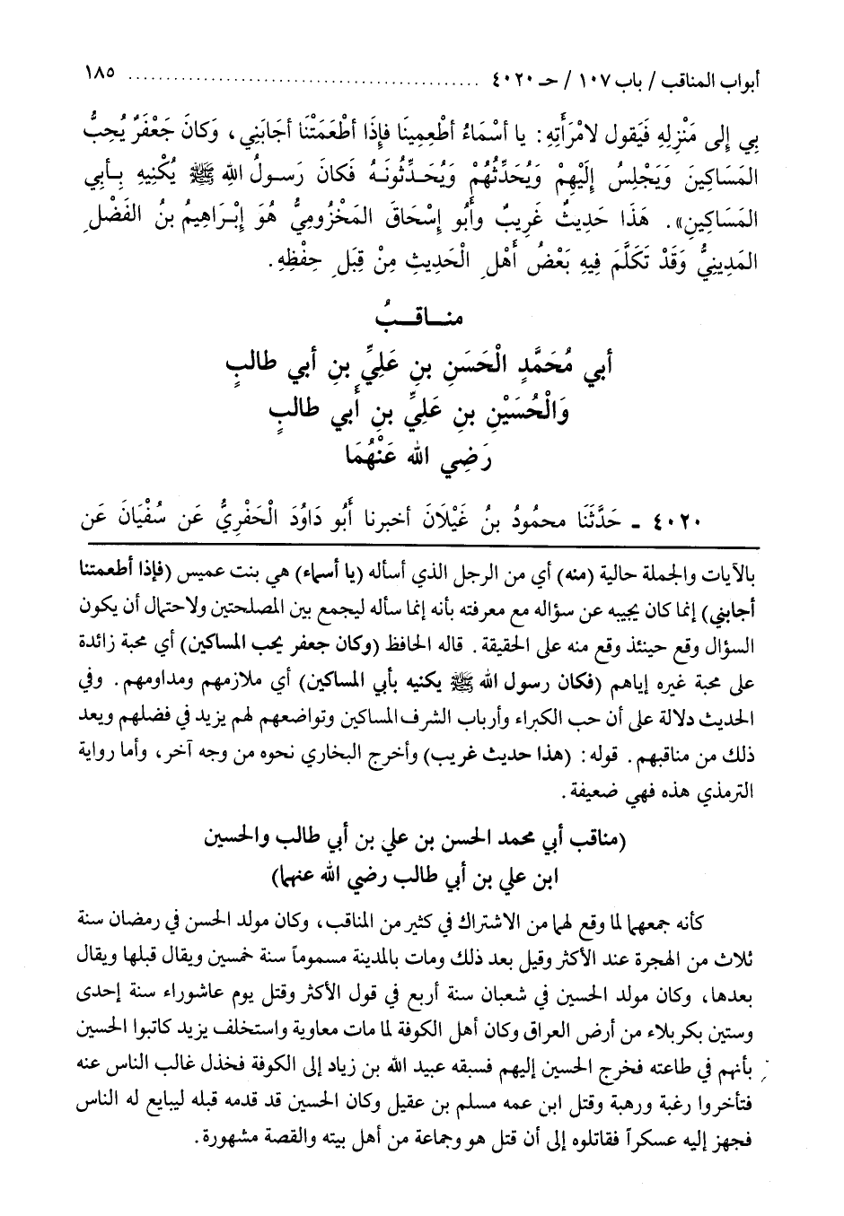 وَالْحُسَيْنِ بْنِ عَلِيِّ بْنِ أَبِي طَالِبٍ رَضِيَ اللَّهُ عَنْهُمَا كَأَنَّهُ جَمَعَهُمَا لِمَا وَقَعَ لَهُمَا مِنَ الِاشْتِرَاكِ فِي كَثِيرٍ مِنَ الْمَنَاقِبِ وَكَانَ مَوْلِدُ الْحَسَنِ فِي رَمَضَانَ سَنَةَ ثَلَاثٍ مِنَ الْهِجْرَةِ عِنْدَ الْأَكْثَرِ وَقِيلَ بَعْدَ ذَلِكَ وَمَاتَ بِالْمَدِينَةِ مَسْمُومًا سَنَةَ خَمْسِينَ وَيُقَالُ قَبْلَهَا وَيُقَالُ بَعْدَهَا وَكَانَ مَوْلِدُ الْحُسَيْنِ فِي شَعْبَانَ سَنَةَ أَرْبَعٍ فِي قَوْلِ الْأَكْثَرِ وَقُتِلَ يَوْمَ عَاشُورَاءَ سَنَةَ إِحْدَى وَسِتِّينَ بِكَرْبَلَاءَ مِنْ أَرْضِ الْعِرَاقِ وَكَانَ أَهْلُ الْكُوفَةِ لَمَّا مَاتَ مُعَاوِيَةُ وَاسْتَخْلَفَ يَزِيدَ كَاتَبُوا الْحُسَيْنَ بِأَنَّهُمْ فِي طَاعَتِهِ فَخَرَجَ الْحُسَيْنُ إِلَيْهِمْ فَسَبَقَهُ عُبَيْدُ اللَّهِ بْنُ زِيَادٍ إِلَى الْكُوفَةِ فَخَذَّلَ غَالِبَ النَّاسِ عنه فتأخروا رغبة ورهبة وقتل بن عَمِّهِ مُسْلِمُ بْنُ عَقِيلٍ وَكَانَ الْحُسَيْنُ قَدْ قَدَّمَهُ قَبْلَهُ لِيُبَايِعَ لَهُ النَّاسَ فَجَهَّزَ إِلَيْهِ عَسْكَرًا فَقَاتَلُوهُ إِلَى أَنْ قُتِلَ هُوَ وَجَمَاعَةٌ مِنْ أَهْلِ بَيْتِهِ وَالْقِصَّةُ مَشْهُورَةٌ