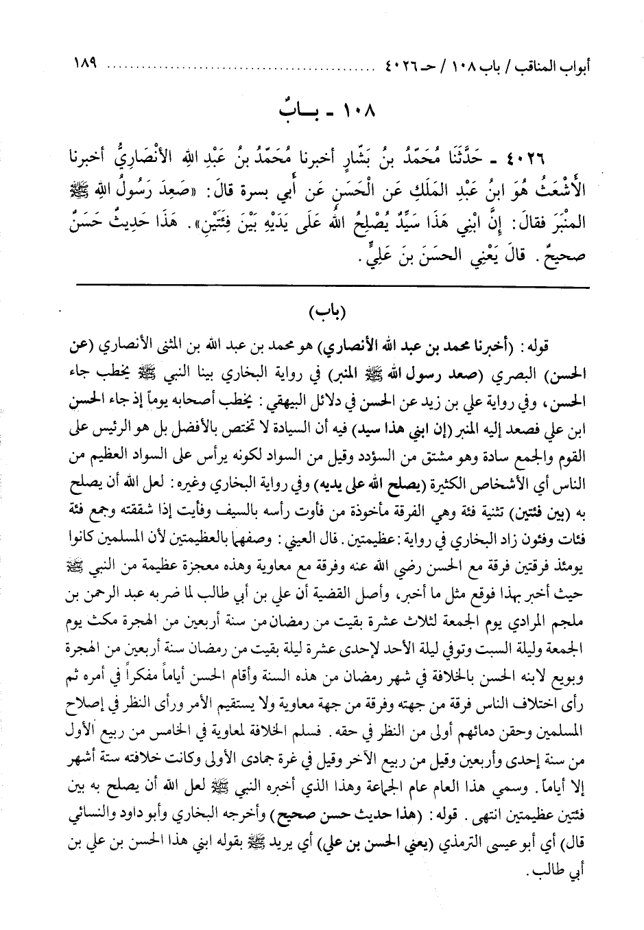 90 - باب [3773] قوله (حَدَّثَنَا مُحَمَّدُ بْنُ عَبْدِ اللَّهِ الْأَنْصَارِيُّ) هُوَ مُحَمَّدُ بْنُ عَبْدِ اللَّهِ بْنِ الْمُثَنَّى الْأَنْصَارِيُّ (عَنِ الْحَسَنِ) الْبَصْرِيِّ (صَعِدَ رَسُولُ اللَّهِ صَلَّى اللَّهُ عَلَيْهِ وَسَلَّمَ الْمِنْبَرَ) فِي رِوَايَةِ الْبُخَارِيِّ بَيْنَا النَّبِيُّ صَلَّى اللَّهُ عَلَيْهِ وَسَلَّمَ يَخْطُبُ جَاءَ الْحَسَنُ وَفِي رِوَايَةِ عَلِيِّ بْنِ زَيْدٍ عَنِ الْحَسَنِ فِي دَلَائِلِ الْبَيْهَقِيِّ يَخْطُبُ أَصْحَابَهُ يَوْمًا إِذْ جَاءَ الْحَسَنُ بْنُ عَلِيٍّ فَصَعِدَ إِلَيْهِ الْمِنْبَرَ (إِنَّ ابْنِي هَذَا سَيِّدٌ) فِيهِ أَنَّ السِّيَادَةَ لَا تَخْتَصُّ بِالْأَفْضَلِ بَلْ هُوَ الرَّئِيسُ عَلَى الْقَوْمِ وَالْجَمْعُ سَادَةٌ وَهُوَ مُشْتَقٌّ مِنَ السُّؤْدُدِ وَقِيلَ مِنَ السَّوَادِ لِكَوْنِهِ يَرْأَسُ عَلَى السَّوَادِ الْعَظِيمِ مِنَ النَّاسِ أَيِ الْأَشْخَاصِ الْكَثِيرَةِ (يُصْلِحُ اللَّهُ عَلَى يَدَيْهِ) وَفِي رِوَايَةِ الْبُخَارِيِّ وَغَيْرِهِ لَعَلَّ اللَّهَ أَنْ يُصْلِحَ بِهِ (بَيْنَ فِئَتَيْنِ) تَثْنِيَةُ فِئَةٍ وَهِيَ الْفِرْقَةُ مَأْخُوذَةٌ مِنْ فَأَوْتُ رَأْسَهُ بِالسَّيْفِ وَفَأَيْتُ إِذَا شَقَقْتُهُ وَجَمْعُ فئة فئات فئون زَادَ الْبُخَارِيُّ فِي رِوَايَةٍ عَظِيمَتَيْنِ