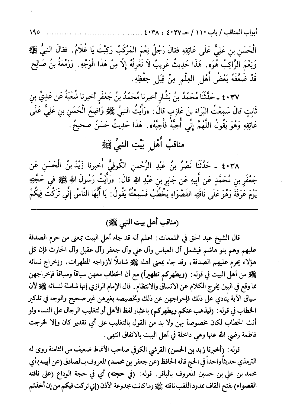 93 - مناقب أهل بيت النبي صَلَّى اللَّهُ عَلَيْهِ وَسَلَّمَ قَالَ الشَّيْخُ عَبْدُ الْحَقِّ فِي اللُّمَعَاتِ اعْلَمْ أَنَّهُ قَدْ جَاءَ أَهْلُ الْبَيْتِ بِمَعْنَى مَنْ حَرُمَ الصَّدَقَةُ عَلَيْهِمْ وَهُمْ بَنُو هَاشِمٍ فَيَشْمَلُ آلَ الْعَبَّاسِ وَآلَ عَلِيٍّ وَآلَ جَعْفَرٍ وَآلَ عَقِيلٍ وَآلَ الْحَارِثِ فَإِنَّ كُلَّ هَؤُلَاءِ يَحْرُمُ عَلَيْهِمُ الصَّدَقَةُ وَقَدْ جَاءَ بِمَعْنَى أَهْلِهِ صَلَّى اللَّهُ عَلَيْهِ وَسَلَّمَ شَامِلًا لِأَزْوَاجِهِ الْمُطَهَّرَاتِ وَإِخْرَاجُ نِسَائِهِ صَلَّى اللَّهُ عَلَيْهِ وَسَلَّمَ مِنْ أهل البيت في قوله (ويطهركم تطهيرا) مَعَ أَنَّ الْخِطَابَ مَعَهُنَّ سِبَاقًا وَسِيَاقًا فَإِخْرَاجُهُنَّ مِمَّا وَقَعَ فِي الْبَيْنِ يُخْرِجُ الْكَلَامَ عَنِ الِاتِّسَاقِ وَالِانْتِظَامِ