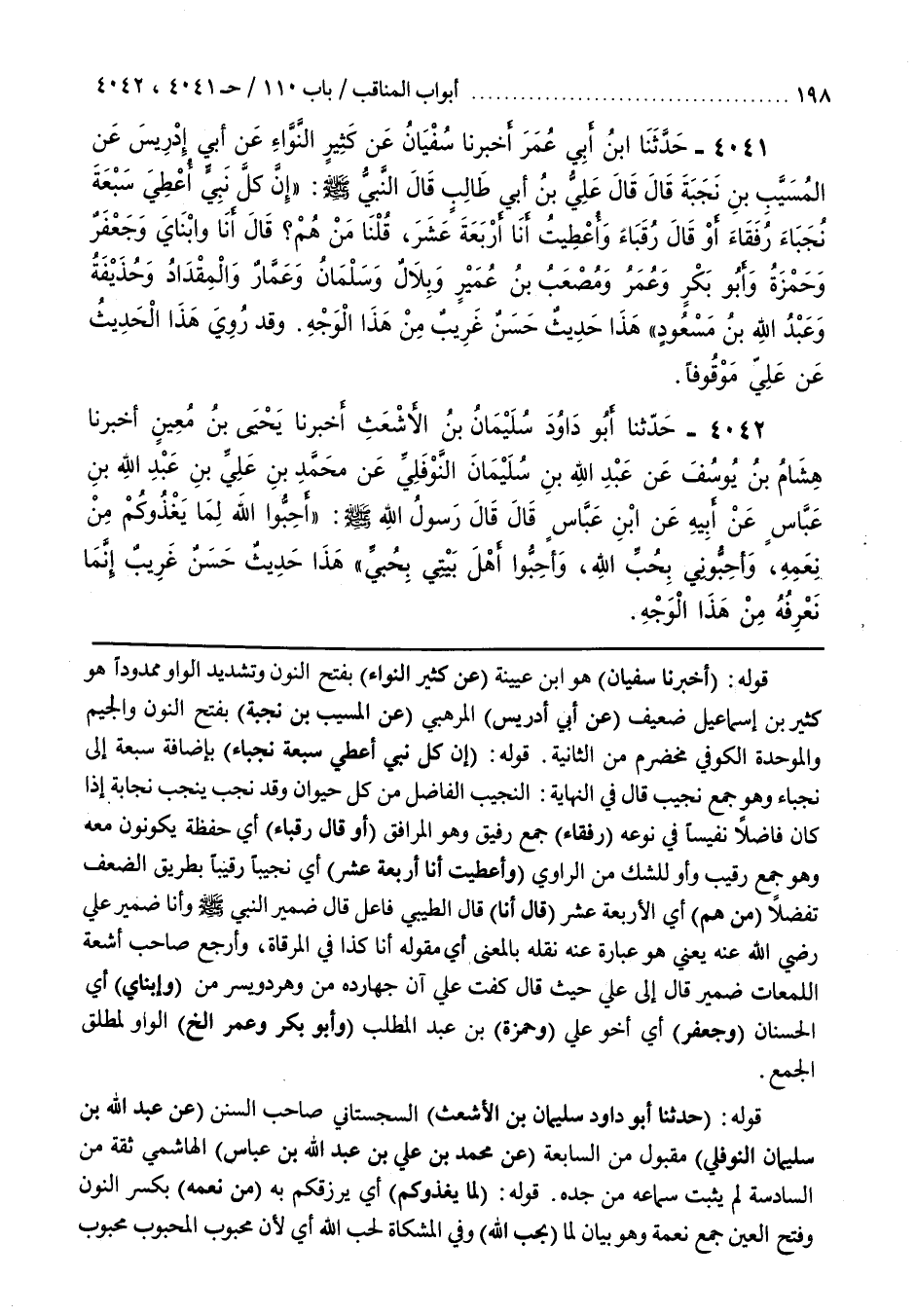 قَوْلُهُ (إِنَّ كُلَّ نَبِيٍّ أُعْطِيَ سَبْعَةَ نُجَبَاءَ) بِإِضَافَةِ سَبْعَةٍ إِلَى نُجَبَاءَ وَهُوَ جَمْعُ نَجِيبٍ قَالَ فِي النِّهَايَةِ النَّجِيبُ الْفَاضِلُ مِنْ كُلِّ حَيَوَانٍ وَقَدْ نَجُبَ يَنْجُبُ نَجَابَةً إِذَا كَانَ فَاضِلًا نَفِيسًا فِي نَوْعِهِ (رُفَقَاءَ) جَمْعُ رَفِيقٍ وَهُوَ الْمُرَافِقُ (أَوْ قَالَ رُقَبَاءَ) أَيْ حَفَظَةً يَكُونُونَ مَعَهُ وَهُوَ جَمْعُ رَقِيبٍ وَأَوْ لِلشَّكِّ مِنَ الرَّاوِي (وَأُعْطِيتُ أَنَا أَرْبَعَةَ عَشَرَ) أَيْ نَجِيبًا رَقِيبًا بِطَرِيقِ الضِّعْفِ تَفَضُّلًا (مَنْ هُمْ) أَيِ الْأَرْبَعَةَ عَشَرَ (قَالَ أَنَا) قَالَ الطِّيبِيُّ فَاعِلُ قَالَ ضَمِيرُ النَّبِيِّ صَلَّى اللَّهُ عَلَيْهِ وَسَلَّمَ وَأَنَا ضَمِيرُ عَلِيٍّ رَضِيَ اللَّهُ عَنْهُ يَعْنِي هُوَ عِبَارَةٌ عَنْهُ نَقَلَهُ بِالْمَعْنَى أَيْ مَقُولُهُ أَنَا كَذَا فِي الْمِرْقَاةِ وأرجع صاحب أشعة اللمعات ضمير قال إلا عَلِيٍّ حَيْثُ قَالَ كفت علي آن جهارده من وهر دويسر من (وَابْنَايَ) أَيِ الْحَسَنَانِ (وَجَعْفَرٌ) أَيْ أَخُو عَلِيٍّ (وَحَمْزَةُ) بْنُ عَبْدِ الْمُطَّلِبِ (وَأَبُو بَكْرٍ وَعُمَرُ إِلَخْ) الْوَاوُ لِمُطْلَقِ الْجَمْعِ