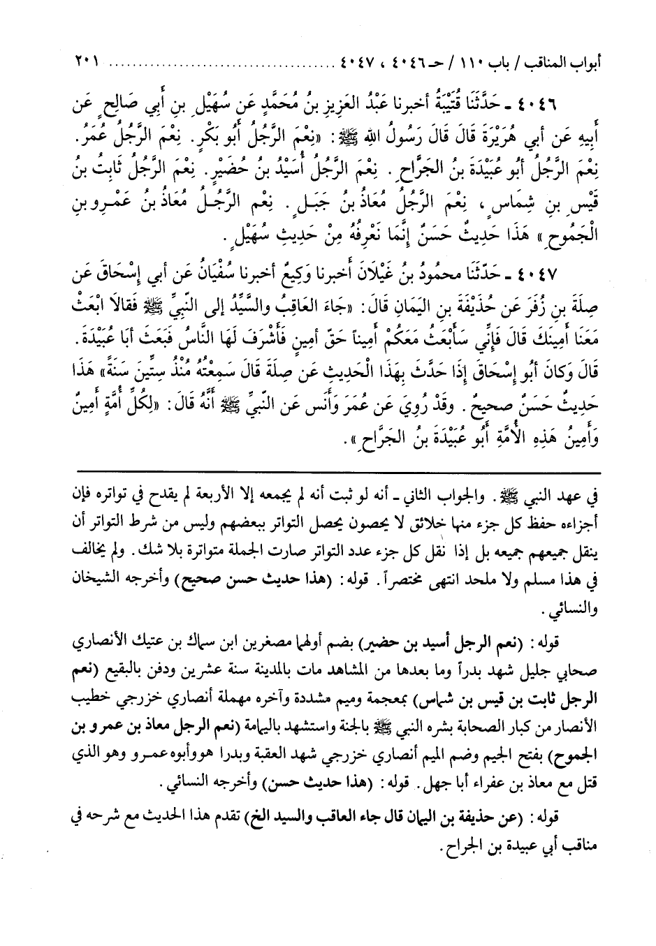 [3795] قَوْله (نِعْمَ الرَّجُلُ أُسَيْدُ بْنُ حُضَيْرٍ) بِضَمِّ أولهما مصغرين بن سِمَاكَ بْنِ عَتِيكَ الْأَنْصَارِيُّ صَحَابِيٌّ جَلِيلٌ شَهِدَ بَدْرًا وَمَا بَعْدهَا مِنَ الْمَشَاهَدِ مَاتَ بِالْمَدِينَةِ سَنَة عِشْرِينَ وَدُفِنَ بِالْبَقِيعِ (نِعْمَ الرَّجُلُ ثَابِتُ بْنُ قَيْسِ بْنِ شَمَّاسٍ) بِمُعْجَمَةٍ وَمِيمٍ مُشَدَّدَةٍ وَآخِرُهُ مُهْمَلَةٌ أَنْصَارِيٌّ خَزْرَجِيٌّ خَطِيبُ الْأَنْصَارِ مِنْ كِبَارِ الصَّحَابَةِ بَشَّرَهُ النَّبِيُّ صَلَّى اللَّهُ عَلَيْهِ وَسَلَّمَ بِالْجَنَّةِ وَاسْتُشْهِدَ بِالْيَمَامَةِ (نِعْمَ الرَّجُلُ مُعَاذُ بْنُ عَمْرِو بْنِ الْجَمُوحِ) بِفَتْحِ الْجِيمِ وَضَمِّ الميم أنصاري خزرجي شهد العقبة وبدرا وهو وَأَبُوهُ عَمْرٌو وَهُوَ الَّذِي قَتَلَ مَعَ مُعَاذِ بْنِ عَفْرَاءَ أَبَا جَهْلٍ