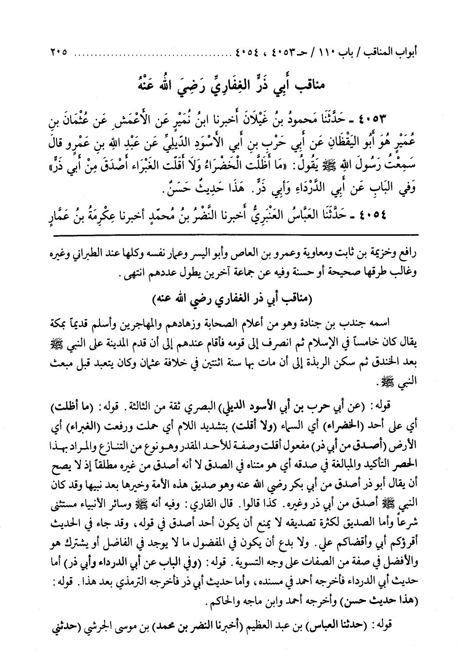 قَوْلُهُ (مَا أَظَلَّتِ) أَيْ عَلَى أَحَدٍ (الْخَضْرَاءُ) أَيِ السَّمَاءُ (وَلَا أَقَلَّتِ) بِتَشْدِيدِ اللَّامِ أَيْ حَمَلَتْ وَرَفَعَتْ (الْغَبْرَاءُ) أَيِ الْأَرْضُ (أَصْدَقَ مِنْ أَبِي ذَرٍّ) مَفْعُولُ أَقَلَّتْ وَصِفَةٌ لِلْأَحَدِ الْمُقَدَّرِ وَهُوَ نَوْعٌ مِنَ التَّنَازُعِ وَالْمُرَادُ بِهَذَا الْحَصْرِ التَّأْكِيدُ وَالْمُبَالَغَةُ فِي صِدْقِهِ أَيْ هُوَ مَتْنَاهٍ فِي الصِّدْقِ لَا أَنَّهُ أَصْدَقُ مِنْ غَيْرِهِ مُطْلَقًا إِذْ لَا يَصِحُّ أَنْ يُقَالَ أَبُو ذَرٍّ أَصْدَقُ مِنْ أَبِي بَكْرٍ رَضِيَ اللَّهُ عَنْهُ وَهُوَ صِدِّيقُ هَذِهِ الْأُمَّةِ وَخَيْرُهَا بَعْدَ نَبِيِّهَا وَقَدْ كَانَ النَّبِيُّ صَلَّى اللَّهُ عَلَيْهِ وَسَلَّمَ أَصْدَقَ مِنْ أَبِي ذَرٍّ وَغَيْرِهِ
