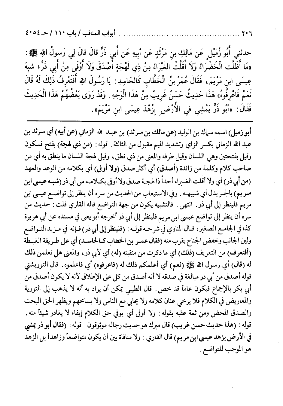 قَوْلُهُ (مِنْ ذِي لَهْجَةٍ) بِفَتْحٍ فَسُكُونٍ وَقِيلَ بِفَتْحَتَيْنِ وَهِيَ اللِّسَانُ وَقِيلَ طَرَفُهُ وَالْمَعْنَى مِنْ ذِي نُطْقٍ وَقِيلَ لَهْجَةُ اللِّسَانِ مَا يُنْطَقُ بِهِ أَيْ مِنْ صَاحِبِ كَلَامٍ وَكَلِمَةُ من زائدة (أصدق) أي أكثر صدق (وَلَا أَوْفَى) أَيْ بِكَلَامِهِ مِنَ الْوَعْدِ وَالْعَهْدِ (مِنْ أَبِي ذَرٍّ) أَيْ وَلَا أَقَلَّتِ الْغَبْرَاءُ أَحَدًا ذَا لَهْجَةٍ وَصِدْقٍ وَلَا أَوْفَى بِكَلَامِهِ من أبي ذر (شبه عيسى بن مَرْيَمَ) بِالْجَرِّ بَدَلٌ أَيْ شَبِيهَهُ