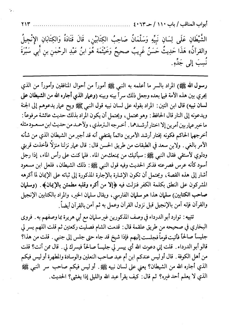 (وَسَلْمَانُ صَاحِبُ الْكِتَابَيْنِ) سَلْمَانُ هَذَا هُوَ سَلْمَانُ الْفَارِسِيُّ وَيُقَالُ سَلْمَانُ الْخَيْرِ وَالْمُرَادُ بِالْكِتَابَيْنِ الْإِنْجِيلُ وَالْقُرْآنُ فَإِنَّهُ آمَنَ بِالْإِنْجِيلِ قَبْلَ نُزُولِ الْقُرْآنِ وَعَمِلَ بِهِ ثُمَّ آمَنَ بِالْقُرْآنِ أَيْضًا