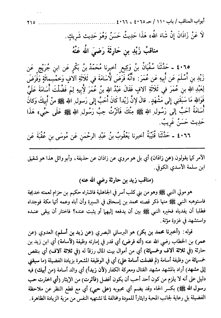 01 - مناقب زيد بن حارثة رضي الله عنه هُوَ مَوْلَى النَّبِيِّ صَلَّى اللَّهُ عَلَيْهِ وَسَلَّمَ وَهُوَ مِنَ بَنِي كَلْبٍ أُسِرَ فِي الْجَاهِلِيَّةِ فَاشْتَرَاهُ حَكِيمُ بْنُ حِزَامٍ لِعَمَّتِهِ خَدِيجَةَ فَاسْتَوْهَبَهُ النَّبِيُّ صَلَّى اللَّهُ عَلَيْهِ وَسَلَّمَ مِنْهَا ذَكَرَ قِصَّتَهُ مُحَمَّدُ بْنُ إِسْحَاقَ فِي السِّيرَةِ وَأَنَّ أباه وعمه أتيا مكة فوجداه فطلبا يَفْدِيَاهُ فَخَيَّرَهُ النَّبِيُّ صَلَّى اللَّهُ عَلَيْهِ وَسَلَّمَ بَيْنَ أَنْ يَدْفَعَهُ إِلَيْهِمَا أَوْ يَثْبُتَ عِنْدَهُ فَاخْتَارَ أَنْ يَبْقَى عِنْدَهُ وَاسْتُشْهِدَ فِي غَزْوَةِ مؤتة