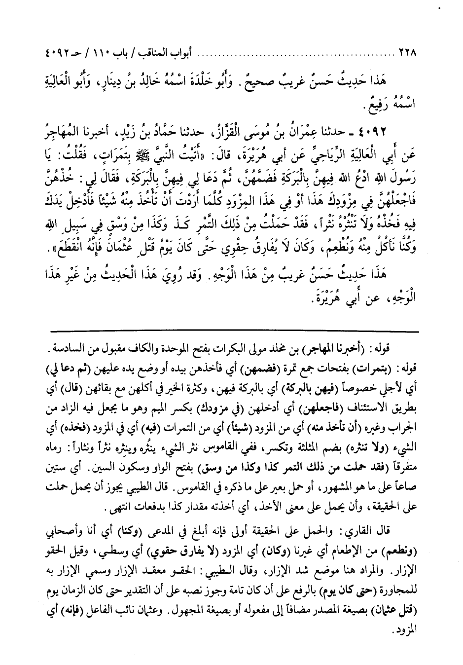 قَوْلُهُ (بِتَمَرَاتٍ) بِفَتَحَاتٍ جَمْعُ تَمْرَةٍ (فَضَمَّهُنَّ) أَيْ فَأَخَذَهُنَّ بِيَدِهِ أَوْ وَضَعَ يَدَهُ عَلَيْهِنَّ (ثُمَّ دَعَا لِي) أَيْ لِأَجْلِي خُصُوصًا (فِيهِنَّ بِالْبَرَكَةِ) أَيْ بِالْبَرَكَةِ فِيهِنَّ وَكَثْرَةِ الْخَيْرِ فِي أَكْلِهِنَّ مَعَ بَقَائِهِنَّ (قَالَ) أَيْ بِطَرِيقِ الِاسْتِئْنَافِ (فَاجْعَلْهُنَّ) أَيْ أَدْخِلْهُنَّ (فِي مِزْوَدِكَ) بِكَسْرِ الْمِيمِ وَهُوَ مَا يُجْعَلُ فِيهِ الزَّادُ مِنَ الْجِرَابِ وَغَيْرِهِ (أَنْ تَأْخُذَ مِنْهُ) أَيْ مِنَ الْمِزْوَدِ (شَيْئًا) أَيْ مِنَ التَّمَرَاتِ (فِيهِ) أَيْ فِي الْمِزْوَدِ (فَخُذْهُ) أَيِ الشَّيْءَ (وَلَا تَنْثُرْهُ) بِضَمِّ الْمُثَلَّثَةِ وَتُكْسَرُ فَفِي الْقَامُوسِ نَثَرَ الشَّيْءَ يَنْثُرُهُ وَيَنْثِرُهُ نَثْرًا وَنِثَارًا رَمَاهُ مُتَفَرِّقًا (فَقَدْ حَمَلْتُ مِنْ ذَلِكَ التَّمْرِ كَذَا وَكَذَا مِنْ وَسْقٍ) بِفَتْحِ الْوَاوِ وَسُكُونِ السِّينِ