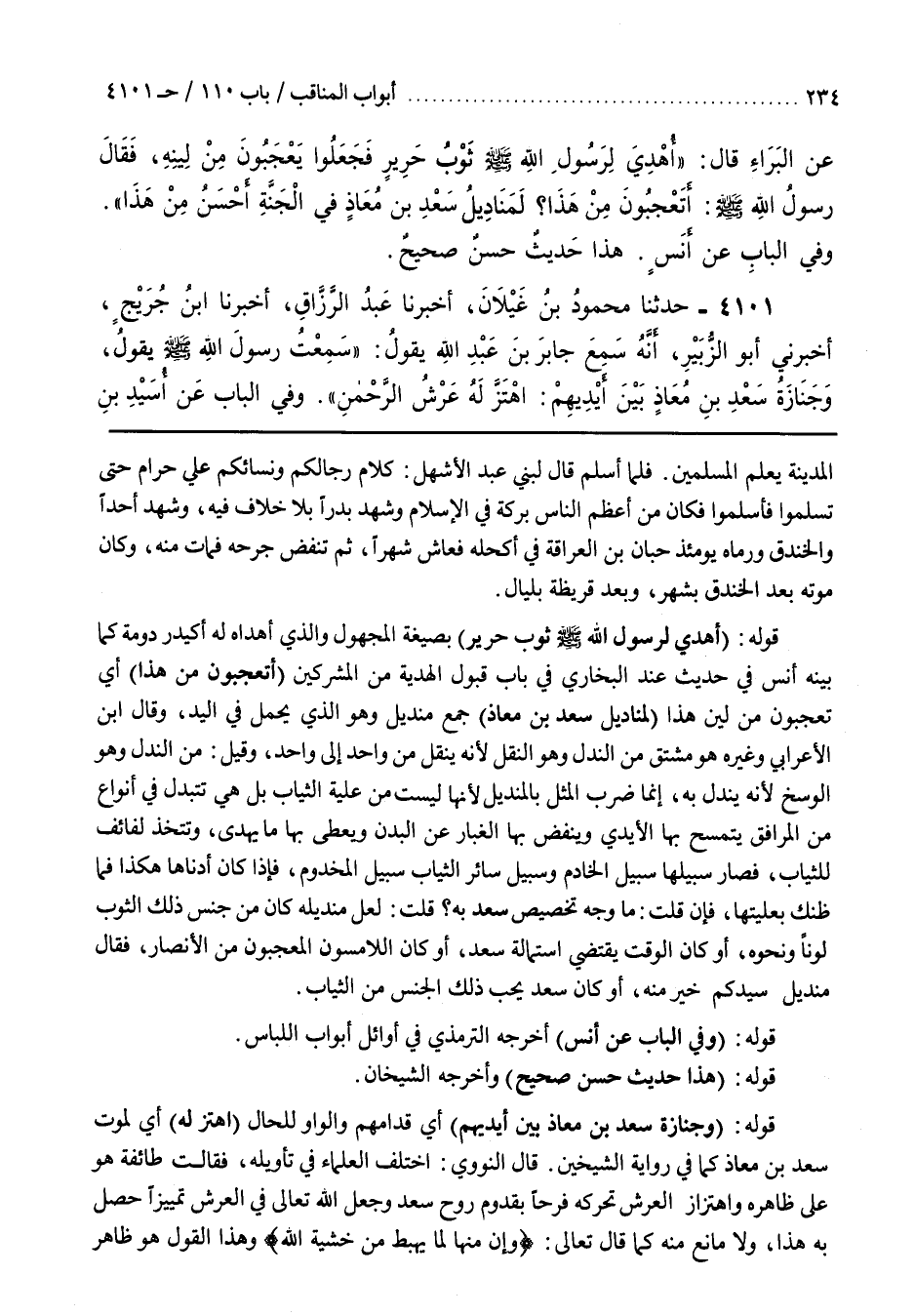 [3847] قَوْلُهُ (أَهْدَى لِرَسُولِ اللَّهِ صَلَّى اللَّهُ عَلَيْهِ وَسَلَّمَ ثَوْبُ حَرِيرٍ) بِصِيغَةِ الْمَجْهُولِ وَالَّذِي أهداه له أكيدر درمة كَمَا بَيَّنَهُ أَنَسٌ فِي حَدِيثِهِ عِنْدَ الْبُخَارِيِّ فِي بَابِ قَبُولِ الْهَدِيَّةِ مِنَ الْمُشْرِكِينَ (أَتَعْجَبُونَ مِنْ هَذَا) أَيْ تَعْجَبُونَ مِنْ لِينِ هَذَا (لَمَنَادِيلُ سَعْدِ بْنِ مُعَاذٍ) جَمْعُ مِنْدِيلٍ وَهُوَ الذي يحمل في اليد وقال بن الْأَعْرَابِيِّ وَغَيْرُهُ هُوَ مُشْتَقٌّ مِنَ النَّدْلِ وَهُوَ النَّقْلُ لِأَنَّهُ يُنْقَلُ مِنْ وَاحِدٍ إِلَى وَاحِدٍ وَقِيلَ مِنَ النَّدَلِ وَهُوَ الْوَسَخُ لِأَنَّهُ يَنْدَلُّ بِهِ إِنَّمَا ضَرَبَ الْمَثَلَ بِالْمِنْدِيلِ لِأَنَّهَا لَيْسَتْ مِنْ عَلِيَّةِ الثِّيَابِ بَلْ هِيَ تَتَبَدَّلُ فِي أَنْوَاعٍ مِنَ الْمَرَافِقِ يُتَمَسَّحُ بِهَا الْأَيْدِي وَيُنْفَضُ بِهَا الْغُبَارُ عَنِ الْبَدَنِ وَيُعْطَى بِهَا مَا يُهْدَى وَتُتَّخَذُ لَفَائِفَ لِلثِّيَابِ فَصَارَ سَبِيلُهَا سَبِيلَ الْخَادِمِ وَسَبِيلُ سَائِرِ الثِّيَابِ سَبِيلَ الْمَخْدُومِ فَإِذَا كَانَ أَدْنَاهَا هَكَذَا فَمَا ظَنُّكَ بِعَلِيَّتِهَا فَإِنْ قلت ما وجه تخصص سَعْدٍ بِهِ قُلْتُ لَعَلَّ مِنْدِيلِهِ كَانَ مِنْ جِنْسِ ذَلِكَ الثَّوْبِ لَوْنًا وَنَحْوَهُ أَوْ كَانَ الْوَقْتُ يَقْتَضِي اسْتِمَالَةَ سَعْدٍ أَوْ كَانَ اللَّامِسُونَ الْمُتَعَجِّبُونَ مِنَ الْأَنْصَارِ فَقَالَ مِنْدِيلُ سَيِّدِكُمْ خَيْرٌ مِنْهُ أَوْ كَانَ سَعْدٌ يُحِبُّ ذَلِكَ الْجِنْسَ مِنَ الثِّيَابِ