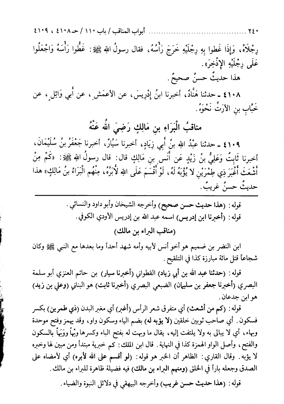 وقال القارىء الظَّاهِرُ أَنَّ الْخَبَرَ هُوَ قَوْلُهُ (لَوْ أَقْسَمَ عَلَى اللَّهِ لَأَبَرَّهُ) أَيْ لَأَمْضَاهُ عَلَى الصِّدْقِ وَجَعَلَهُ بَارًّا فِي الْخُلُقِ (مِنْهُمُ الْبَرَاءُ بْنُ مَالِكٍ) فِيهِ فَضِيلَةٌ ظَاهِرَةٌ لِلْبَرَاءِ بْنِ مَالِكٍ