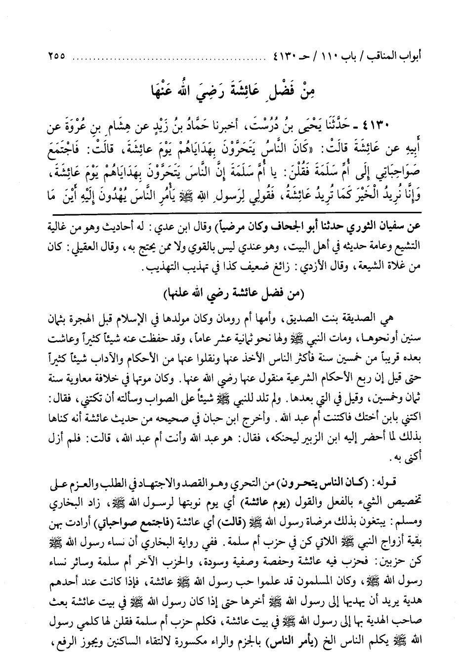 هِيَ الصِّدِّيقَةُ بِنْتُ الصِّدِّيقِ وَأُمُّهَا أُمُّ رُومَانَ وَكَانَ مَوْلِدُهَا فِي الْإِسْلَامِ قَبْلَ الْهِجْرَةِ بِثَمَانِ سِنِينَ أَوْ نحوهما ومات النبي وَلَهَا نَحْوُ ثَمَانِيَةَ عَشَرَ عَامًا وَقَدْ حَفِظَتْ عَنْهُ شَيْئًا كَثِيرًا وَعَاشَتْ بَعْدَهُ قَرِيبًا مِنْ خَمْسِينَ سَنَةً فَأَكْثَرَ النَّاسُ الْأَخْذَ عَنْهَا وَنَقَلُوا عَنْهَا مِنَ الْأَحْكَامِ وَالْآدَابِ شَيْئًا كَثِيرًا حَتَّى قِيلَ إِنَّ رُبُعَ الْأَحْكَامِ الشَّرْعِيَّةِ مَنْقُولٌ عَنْهَا رَضِيَ اللَّهُ عَنْهَا