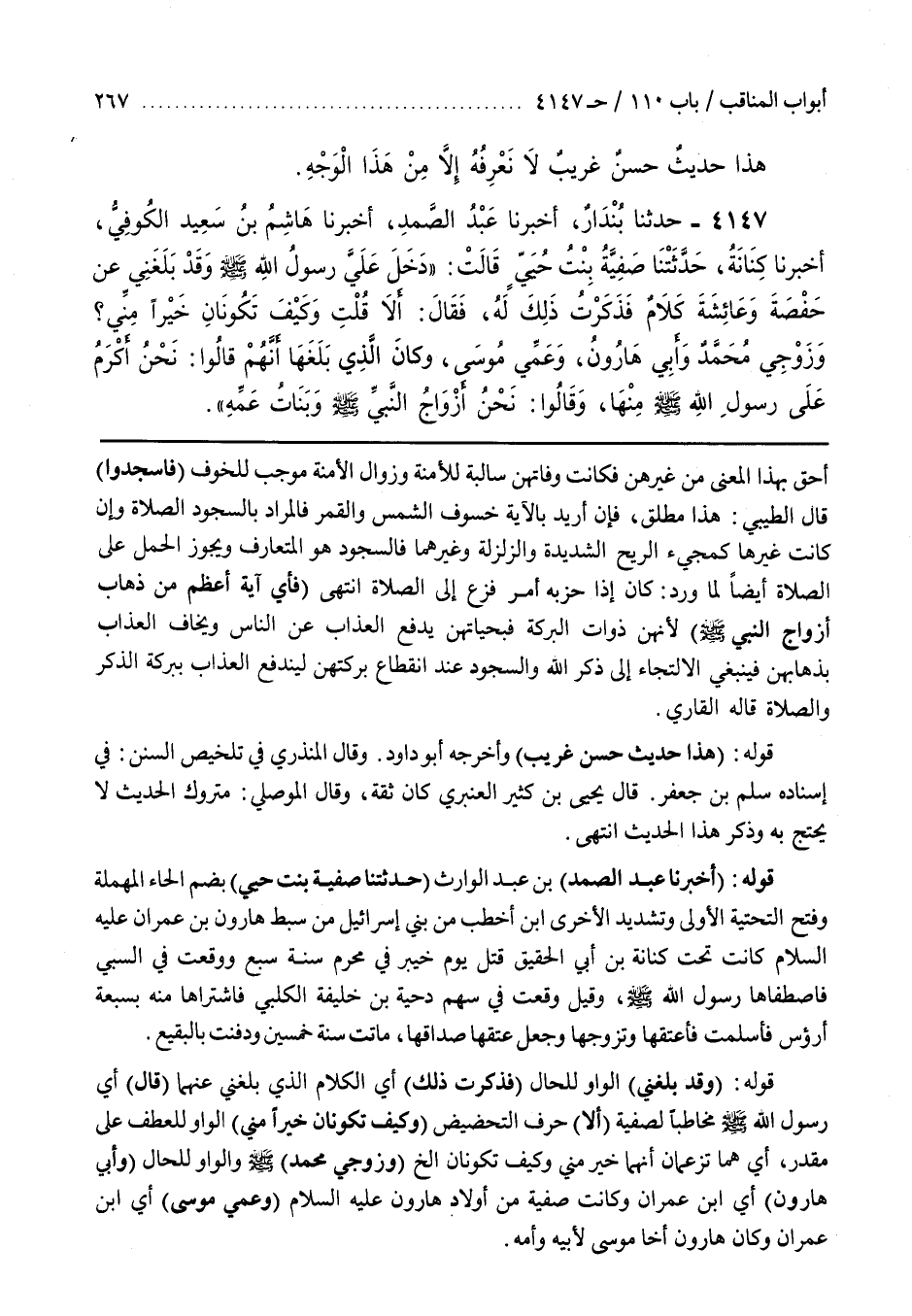 قوله (وقد بلغني) الواو للحال (فذكرت ذَلِكَ) أَيِ الْكَلَامَ الَّذِي بَلَغَنِي عَنْهُمَا (قَالَ) أَيْ رَسُولُ اللَّهِ صَلَّى اللَّهُ عَلَيْهِ وسلم مُخَاطِبًا لِصَفِيَّةَ (أَلَا) حَرْفُ التَّحْضِيضِ (وَكَيْفَ تَكُونَانِ خَيْرًا مِنِّي) الْوَاوُ لِلْعَطْفِ عَلَى مُقَدَّرٍ أَيْ هُمَا تَزْعُمَانِ أَنَّهُمَا خَيْرٌ مِنِّي وَكَيْفَ تَكُونَانِ إِلَخْ (وَزَوْجِي مُحَمَّدٌ) صَلَّى اللَّهُ عَلَيْهِ وَسَلَّمَ والواو للحال (وأبي هارون) أي بن عِمْرَانَ وَكَانَتْ صَفِيَّةُ مِنْ أَوْلَادِ هَارُونَ عَلَيْهِ السلام (وعمي موسى) أي بن عِمْرَانَ وَكَانَ هَارُونُ أَخَا مُوسَى لِأَبِيهِ وَأُمِّهِ