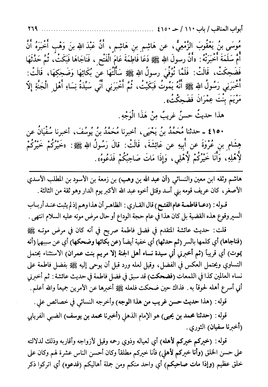 قُلْتُ حَدِيثُ عَائِشَةَ الْمُتَقَدِّمُ فِي فَضْلِ فَاطِمَةَ صَرِيحٌ فِي أَنَّهُ كَانَ فِي مَرَضِ مَوْتِهِ صَلَّى اللَّهُ عَلَيْهِ وَسَلَّمَ (فَنَاجَاهَا) أَيْ كَلَّمَهَا بِالسِّرِّ (ثُمَّ حَدَّثَهَا) أَيْ خُفْيَةً أَيْضًا (عَنْ بُكَائِهَا وَضَحِكِهَا) أَيْ عَنْ سَبَبِهِمَا (أَنَّهُ يَمُوتُ) أَيْ قَرِيبًا (ثُمَّ أَخْبَرَنِي أَنِّي سَيِّدَةُ نِسَاءِ أَهْلِ الْجَنَّةِ إِلَّا مَرْيَمَ بِنْتَ عِمْرَانَ) الِاسْتِثْنَاءُ يَحْتَمِلُ التَّسَاوِي وَيَحْتَمِلُ الْعَكْسَ فِي الْفَضْلِ وَقِيلَ لَعَلَّهُ وَرَدَ قَبْلَ أَنْ يُوحَى إِلَيْهِ صَلَّى اللَّهُ عَلَيْهِ وَسَلَّمَ بِفَضْلِ فَاطِمَةَ عَلَى نِسَاءِ الْعَالَمِينَ كَذَا فِي اللُّمَعَاتِ (فَضَحِكَتْ) قَدْ سَبَقَ فِي فَضْلِ فَاطِمَةَ فِي حَدِيثِ عَائِشَةَ ثُمَّ أَخْبَرَنِي أَنِّي أَسْرَعُ أَهْلِهِ لُحُوقًا بِهِ