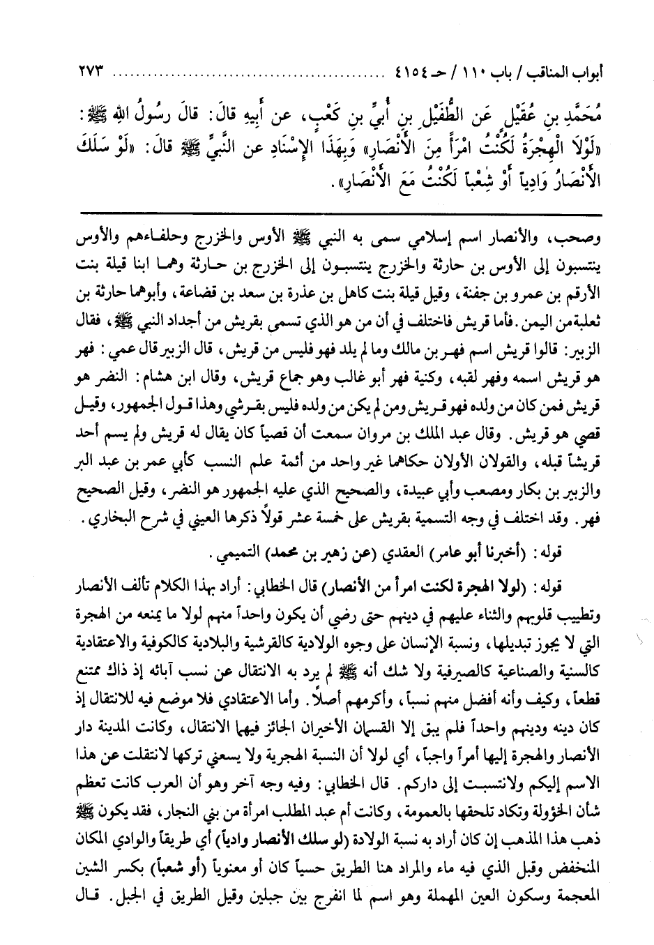 قَالَ الْخَطَّابِيُّ وَفِيهِ وَجْهٌ آخَرُ وَهُوَ أَنَّ الْعَرَبَ كَانَتْ تُعَظِّمُ شَأْنَ الْخُؤُولَةِ وَتَكَادُ تُلْحِقُهَا بِالْعُمُومَةِ وَكَانَتْ أُمُّ عَبْدِ الْمُطَّلِبِ امْرَأَةً مِنْ بَنِي النَّجَّارِ فقد يكون ذَهَبَ هَذَا الْمَذْهَبَ إِنْ كَانَ أَرَادَ بِهِ نِسْبَةَ الْوِلَادَةِ (لَوْ سَلَكَ الْأَنْصَارُ وَادِيًا) أَيْ طَرِيقًا وَالْوَادِي الْمَكَانُ الْمُنْخَفِضُ وَقِيلَ الَّذِي فِيهِ مَاءٌ وَالْمُرَادُ هُنَا الطَّرِيقُ حِسِّيًّا كَانَ أَوْ مَعْنَوِيًّا (أَوْ شِعْبًا) بِكَسْرِ الشِّينِ الْمُعْجَمَةِ وَسُكُونِ الْعَيْنِ الْمُهْمَلَةِ وَهُوَ اسْمٌ لِمَا انْفَرَجَ بَيْنَ جَبَلَيْنِ وَقِيلَ الطَّرِيقُ فِي الْجَبَلِ