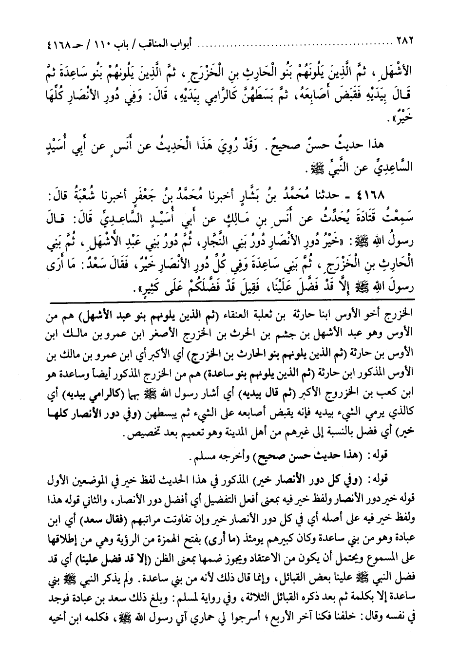 الْخَزْرَجِ أَخُو الْأَوْسِ ابْنَا حَارِثَةَ بْنِ ثَعْلَبَةَ الْعَنْقَاءِ (ثُمَّ الَّذِينَ يَلُونَهُمْ بَنُو عَبْدِ الْأَشْهَلِ) هُمْ مِنَ الْأَوْسِ وَهُوَ عَبْدُ الْأَشْهَلِ بْنِ جَشِيمِ بْنِ الْحَرْثِ بْنِ الْخَزْرَجِ الْأَصْفَرِ بْنِ عمرو بن مالك وبن الْأَوْسِ بْنِ حَارِثَةَ (ثُمَّ الَّذِينَ يَلُونَهُمْ بَنُو الحارث بن الخزرج) أي الأكبر أي بن عَمْرِو بْنِ مَالِكِ بْنِ الْأَوْسِ الْمَذْكُورِ بْنِ حارثة (ثم الَّذِينَ يَلُونَهُمْ بَنُو سَاعِدَةَ) هُمْ مِنَ الْخَزْرَجِ المذكور أيضا وساعدة هو بن كَعْبِ بْنِ الْخَزْرَجِ الْأَكْبَرِ (ثُمَّ قَالَ بِيَدَيْهِ) أَيْ أَشَارَ رَسُولُ اللَّهِ صَلَّى اللَّهُ عَلَيْهِ وَسَلَّمَ بِهِمَا (كَالرَّامِي بِيَدَيْهِ) أَيْ كَالَّذِي يَرْمِي الشَّيْءَ بِيَدَيْهِ فَإِنَّهُ يَقْبِضُ أَصَابِعَهُ عَلَى الشَّيْءِ ثُمَّ يَبْسُطُهُنَّ (وَفِي دُورِ الْأَنْصَارِ كُلِّهَا خَيْرٌ) أَيْ فَضْلٌ بِالنِّسْبَةِ إِلَى غَيْرِهِمْ مِنْ أَهْلِ الْمَدِينَةِ وَهُوَ تَعْمِيمٌ بَعْدَ تَخْصِيصٍ