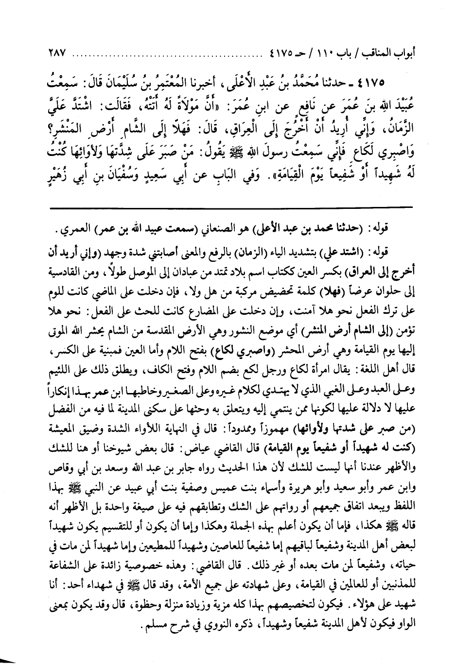 قَوْلُهُ (اشْتَدَّ عَلَيَّ) بِتَشْدِيدِ الْيَاءِ (الزَّمَانُ) بِالرَّفْعِ وَالْمَعْنَى أَصَابَتْنِي شِدَّةٌ وَجُهْدٌ (وَإِنِّي أُرِيدُ أَنْ أَخْرُجَ إِلَى الْعِرَاقِ) بِكَسْرِ الْعَيْنِ كَكِتَابٍ اسْمُ بِلَادٍ تَمْتَدُّ مِنْ عَبَّادَانِ إِلَى الْمَوْصِلِ طُولًا وَمِنَ الْقَادِسِيَّةِ إِلَى حُلْوَانَ عَرْضًا (فَهَلَّا) كَلِمَةُ تَحْضِيضٍ مُرَكَّبَةٌ مِنْ هَلْ وَلَا فَإِنْ دَخَلَتْ عَلَى الْمَاضِي كَانَتْ لِلَّوْمِ عَلَى تَرْكِ الْفِعْلِ نَحْوَ هَلَّا آمَنْتَ وَإِنْ دَخَلَتْ عَلَى الْمُضَارِعِ كَانَتْ لِلْحَثِّ عَلَى الْفِعْلِ نَحْوَ هَلَّا تُؤْمِنُ (إِلَى الشَّامِ أَرْضِ الْمَنْشَرِ) أَيْ مَوْضِعُ النُّشُورِ وَهِيَ الْأَرْضُ الْمُقَدَّسَةُ مِنَ الشَّامِ يَحْشُرُ اللَّهُ الْمَوْتَى إِلَيْهَا يَوْمَ الْقِيَامَةِ وَهِيَ أَرْضُ الْمَحْشَرِ (وَاصْبِرِي لَكَاعِ) بِفَتْحِ اللَّامِ وَأَمَّا الْعَيْنُ فَمَبْنِيَّةٌ عَلَى الْكَسْرِ قَالَ أَهْلُ اللُّغَةِ يُقَالُ امْرَأَةٌ لَكَاعِ وَرَجُلٌ لُكَعٌ بِضَمِّ اللَّامِ وَفَتْحِ الْكَافِ وَيُطْلَقُ ذَلِكَ عَلَى اللَّئِيمِ وَعَلَى الْعَبْدِ وَعَلَى الْغَبِيِّ الَّذِي لَا يهتدي لكلام غيره وعلى الصغير وخاطبها بن عُمَرَ بِهَذَا إِنْكَارًا عَلَيْهَا لَا دَلَالَةً عَلَيْهَا لكونها ممن ينتمي إِلَيْهِ وَيُتَعَلَّقُ بِهِ وَحَثَّهَا عَلَى سُكْنَى الْمَدِينَةِ لِمَا فِيهِ مِنَ الْفَضْلِ (مَنْ صَبَرَ عَلَى شِدَّتِهَا وَلَأْوَائِهَا) مَهْمُوزًا وَمَمْدُودًا قَالَ فِي النِّهَايَةِ اللَّأْوَاءُ الشِّدَّةُ وَضِيقُ الْمَعِيشَةِ (كُنْتُ لَهُ شَهِيدًا أَوْ شَفِيعًا يَوْمَ الْقِيَامَةِ) قَالَ الْقَاضِي عِيَاضٌ قَالَ بَعْضُ شُيُوخِنَا أَوْ هُنَا لِلشَّكِّ وَالْأَظْهَرُ عِنْدَنَا أَنَّهَا لَيْسَتْ لِلشَّكِّ لِأَنَّ هَذَا الْحَدِيثَ رَوَاهُ جَابِرُ بْنُ عَبْدِ اللَّهِ وَسَعْدُ بْنُ أبي وقاص وبن عُمَرَ وَأَبُو سَعِيدٍ وَأَبُو هُرَيْرَةَ وَأَسْمَاءُ بِنْتُ عُمَيْسٍ وَصَفِيَّةُ بِنْتُ أَبِي عُبَيْدٍ عَنِ النَّبِيِّ بِهَذَا اللَّفْظِ وَيَبْعُدُ اتِّفَاقُ جَمِيعِهِمْ أَوْ رُوَاتِهِمْ عَلَى الشَّكِّ وَتَطَابُقُهُمْ فِيهِ عَلَى صِيغَةٍ وَاحِدَةٍ بل الأظهر أنه قاله هَكَذَا فَإِمَّا أَنْ يَكُونَ أَعْلَمَ بِهَذِهِ الْجُمْلَةِ وهكذا وَإِمَّا أَنْ يَكُونَ أَوْ لِلتَّقْسِيمِ يَكُونُ شَهِيدًا لِبَعْضِ أَهْلِ الْمَدِينَةِ وَشَفِيعًا لِبَاقِيهِمْ إِمَّا شَفِيعًا لِلْعَاصِينَ وَشَهِيدًا لِلْمُطِيعِينَ وَإِمَّا شَهِيدًا لِمَنْ مَاتَ فِي حَيَاتِهِ وَشَفِيعًا لِمَنْ مَاتَ بَعْدَهُ أَوْ غَيْرَ ذَلِكَ