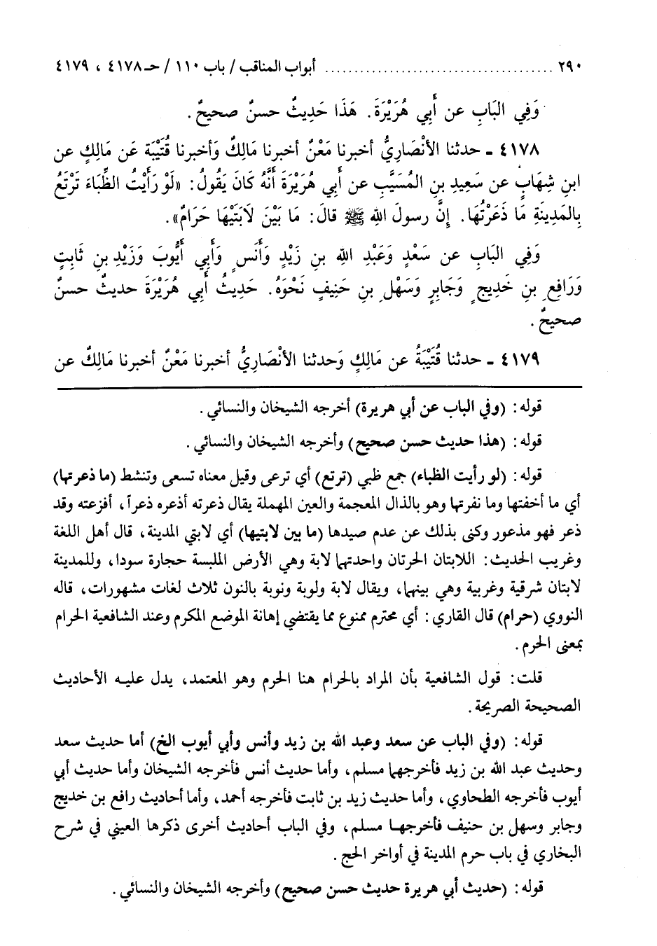 [3921] قَوْلُهُ (لَوْ رَأَيْتُ الظِّبَاءَ) جَمْعُ ظَبْيٍ (تَرْتَعُ) أَيْ تَرْعَى وَقِيلَ مَعْنَاهُ تَسْعَى وَتَنْشَطُ (مَا ذَعَرْتُهَا) أَيْ مَا أَخَفْتُهَا وَمَا نَفَّرْتُهَا وَهُوَ بِالذَّالِ الْمُعْجَمَةِ وَالْعَيْنِ الْمُهْمَلَةِ يُقَالُ ذَعَرْتُهُ أَذْعَرُهُ ذُعْرًا أَفْزَعْتُهُ وَقَدْ ذُعِرَ فَهُوَ مَذْعُورٌ وَكَنَّى بذلك عن عَدَمِ صَيْدِهَا (مَا بَيْنَ لَابَتَيْهَا) أَيْ لَابَتَيِ الْمَدِينَةِ قَالَ أَهْلُ اللُّغَةِ وَغَرِيبِ الْحَدِيثِ اللَّابَتَانِ الْحَرَّتَانِ وَاحِدَتُهُمَا لَابَةٌ وَهِيَ الْأَرْضُ الْمُلْبَسَةُ حِجَارَةً سُودًا وَلِلْمَدِينَةِ لَابَتَانِ شَرْقِيَّةٌ وَغَرْبِيَّةٌ وَهِيَ بَيْنَهُمَا وَيُقَالُ لَابَةٌ وَلُوبَةٌ وَنُوبَةٌ بِالنُّونِ ثَلَاثُ لُغَاتٍ مشهورات قاله النووي (حرام) قال القارىء أَيْ مُحْتَرَمٌ مَمْنُوعٌ مِمَّا يَقْتَضِي إِهَانَةَ الْمَوْضِعِ الْمُكَرَّمِ وَعِنْدَ الشَّافِعِيَّةِ الْحَرَامُ بِمَعْنَى الْحَرَمِ