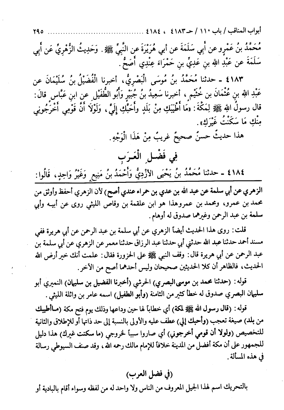 قُلْتُ رَوَى هَذَا الْحَدِيثَ أَيْضًا الزهري عن أبي سلمة بن عبد الرحمن عَنْ أَبِي هُرَيْرَةَ فَفِي مُسْنَدِ أَحْمَدَ حَدَّثَنَا عَبْدُ اللَّهِ حَدَّثَنِي أَبِي حَدَّثَنَا عَبْدُ الرَّزَّاقِ حَدَّثَنَا مَعْمَرٌ عَنِ الزُّهْرِيِّ عَنْ أَبِي سَلَمَةَ بْنِ عَبْدِ الرَّحْمَنِ عَنْ أَبِي هُرَيْرَةَ قَالَ وَقَفَ النَّبِيُّ صَلَّى اللَّهُ عَلَيْهِ وَسَلَّمَ عَلَى الْحَزْوَرَةِ فَقَالَ عَلِمْتُ أَنَّكِ خَيْرُ أَرْضِ اللَّهِ الْحَدِيثَ فَالظَّاهِرُ أَنَّ كِلَا الْحَدِيثَيْنِ صَحِيحَانِ وَلَيْسَ أَحَدُهُمَا أَصَحَّ مِنَ الْآخَرِ