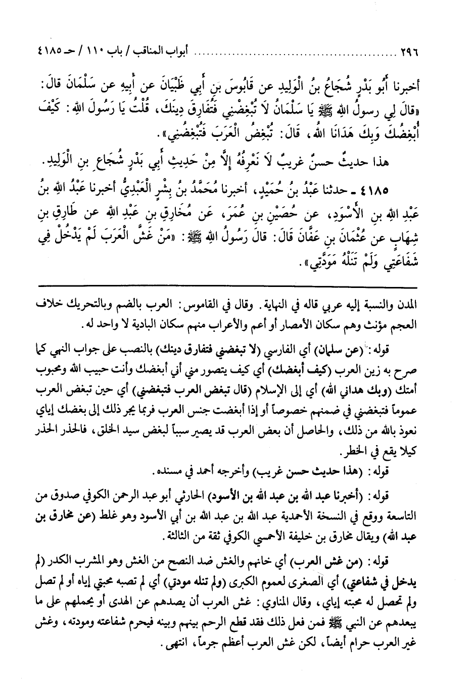 [3927] قَوْلُهُ (عَنْ سَلْمَانَ) أَيِ الْفَارِسِيِّ (لَا تُبْغِضْنِي فَتُفَارِقَ دِينَكَ) بِالنَّصْبِ عَلَى جَوَابِ النَّهْيِ كَمَا صَرَّحَ بِهِ زَيْنُ الْعَرَبِ (كَيْفَ أُبْغِضُكَ) أَيْ كَيْفَ يُتَصَوَّرُ مِنِّي أَنِّي أُبْغِضُكَ وَأَنْتَ حَبِيبُ اللَّهِ وَمَحْبُوبُ أُمَّتِكَ (وَبِكَ هَدَانَا اللَّهُ) أَيْ إِلَى الْإِسْلَامِ (قَالَ تُبْغِضُ الْعَرَبَ فَتُبْغِضُنِي) أَيْ حِينَ تُبْغِضُ الْعَرَبَ عُمُومًا فَتُبْغِضُنِي فِي ضِمْنِهِمْ خُصُوصًا أَوِ إِذَا أَبْغَضْتَ جِنْسَ الْعَرَبِ فَرُبَّمَا يَجُرُّ ذَلِكَ إِلَى بُغْضِكَ إِيَّايَ نَعُوذُ بِاللَّهِ مِنْ ذَلِكَ وَالْحَاصِلُ أَنَّ بُغْضَ الْعَرَبِ قَدْ يَصِيرُ سَبَبًا لِبُغْضِ سَيِّدِ الْخَلْقِ فَالْحَذَرَ الْحَذَرَ كيلا يَقَعَ فِي الْخَطَرِ