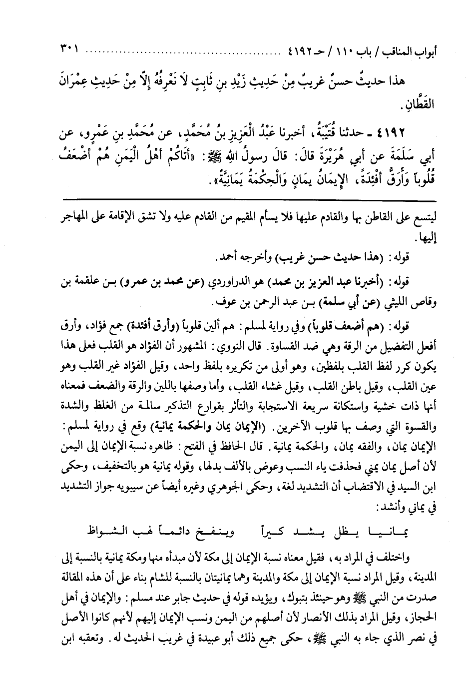 قَالَ الْحَافِظُ فِي الْفَتْحِ ظَاهِرُهُ نِسْبَةُ الْإِيمَانِ إِلَى الْيَمَنِ لِأَنَّ أَصْلَ يَمَانٍ يَمَنِيٌّ فَحُذِفَتْ يَاءُ النَّسَبِ وَعُوِّضَ بِالْأَلِفِ بَدَلَهَا وَقَوْلُهُ يَمَانِيَةٌ هُوَ بِالتَّخْفِيفِ وحكى بن السَّيِّدِ فِي الِاقْتِضَابِ أَنَّ التَّشْدِيدَ لُغَةٌ وَحَكَى الْجَوْهَرِيُّ وَغَيْرُهُ أَيْضًا عَنْ سِيبَوَيْهِ جَوَازَ التَّشْدِيدِ فِي يَمَانِيٍّ وَأَنْشَدَ يَمَانِيًّا يَظَلُّ يَشُدُّ كِيرًا وينفخ دائما لهب الشواط وَاخْتُلِفَ فِي الْمُرَادِ بِهِ فَقِيلَ مَعْنَاهُ نِسْبَةُ الْإِيمَانِ إِلَى مَكَّةَ لِأَنَّ مَبْدَأَهُ مِنْهَا وَمَكَّةُ يَمَانِيَّةٌ بِالنِّسْبَةِ إِلَى الْمَدِينَةِ وَقِيلَ الْمُرَادُ نِسْبَةُ الْإِيمَانِ إِلَى مَكَّةَ وَالْمَدِينَةِ وَهُمَا يَمَانِيَّتَانِ بِالنِّسْبَةِ لِلشَّامِ بِنَاءً عَلَى أَنَّ هَذِهِ الْمَقَالَةَ صَدَرَتْ مِنَ النَّبِيِّ صَلَّى اللَّهُ عَلَيْهِ وَسَلَّمَ وَهُوَ حِينَئِذٍ بِتَبُوكَ وَيُؤَيِّدُهُ قَوْلُهُ فِي حَدِيثِ جَابِرٍ عِنْدَ مُسْلِمٍ وَالْإِيمَانُ فِي أَهْلِ الْحِجَازِ وَقِيلَ الْمُرَادُ بِذَلِكَ الْأَنْصَارُ لِأَنَّ أَصْلَهُمْ مِنَ الْيَمَنِ وَنَسَبَ الْإِيمَانَ إِلَيْهِمْ لِأَنَّهُمْ كَانُوا الْأَصْلَ فِي نَصْرِ الَّذِي جَاءَ بِهِ النَّبِيُّ صَلَّى اللَّهُ عَلَيْهِ وَسَلَّمَ حَكَى جَمِيعَ ذَلِكَ أَبُو عُبَيْدَةَ في غريب الحديث له
