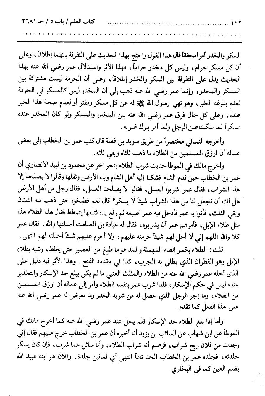 السكر والخدر أمر محققا قَالَ هَذَا الْقَوْلَ وَاحْتَجَّ بِهَذَا الْحَدِيثِ عَلَى التَّفْرِقَةِ بَيْنَهُمَا إِطْلَاقًا وَعَلَى أَنَّ كُلَّ مُسْكِرٍ حَرَامٌ وَلَيْسَ كُلُّ مُخَدِّرٍ حَرَامًا فَهَذَا الْأَثَرُ وَاسْتِدْلَالُ عُمَرَ رَضِيَ اللَّهُ عَنْهُ بِهَذَا الْحَدِيثِ يَدُلُّ عَلَى التَّفْرِقَةِ بَيْنَ السُّكْرِ وَالْخَدَرِ إِطْلَاقًا وَعَلَى أَنَّ الْحُرْمَةَ لَيْسَتْ مُشْتَرِكَةً بَيْنَ الْمُسْكِرِ وَالْمُخَدِّرِ وَإِنَّمَا عُمَرُ رَضِيَ اللَّهُ عَنْهُ ذَهَبَ إِلَى أَنَّ الْمُخَدِّرَ لَيْسَ كَالْمُسْكِرِ فِي الْحُرْمَةِ لِعَدَمِ بُلُوغِهِ الْخَبَرَ وَهُوَ نَهْيُ رَسُولِ اللَّهِ لَهُ عَنْ كُلِّ مُسْكِرٍ وَمُفَتِّرٍ أَوْ لِعَدَمِ صِحَّةِ هَذَا الْخَبَرِ عِنْدَهُ وَعَلَى كُلِّ حَالٍ فَرَّقَ عُمَرُ رَضِيَ اللَّهُ عَنْهُ بَيْنَ الْمُخَدِّرِ وَالْمُسْكِرِ وَإِنْ كَانَ الْمُخَدِّرُ عِنْدَهُ مُسْكِرًا لَمَا سَكَتَ عَنِ الرَّجُلِ وَلَمَا أَمَرَ بِتَرْكِ ضَرْبِهِ