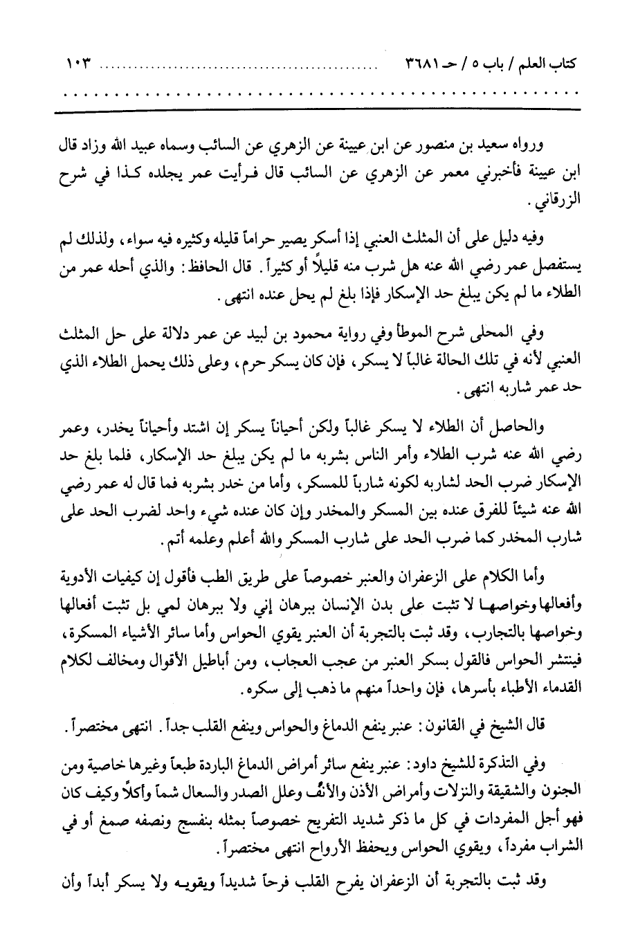 وَأَمَّا الْكَلَامُ عَلَى الزَّعْفَرَانِ وَالْعَنْبَرِ خُصُوصًا عَلَى طَرِيقِ الطِّبِّ فَأَقُولُ إِنَّ كَيْفِيَّاتِ الْأَدْوِيَةِ وَأَفْعَالَهَا وَخَوَاصَّهَا لَا تَثْبُتُ عَلَى بَدَنِ الْإِنْسَانِ بِبُرْهَانٍ آنِيٍّ وَلَا بِبُرْهَانٍ لَمِّيٍّ بَلْ تَثْبُتُ أَفْعَالُهَا وَخَوَاصُّهَا بِالتَّجَارِبِ وَقَدْ ثَبَتَ بِالتَّجْرِبَةِ أَنَّ الْعَنْبَرَ يُقَوِّي الْحَوَاسَّ وَأَمَّا سَائِرُ الْأَشْيَاءِ الْمُسْكِرَةِ فَيَنْتَشِرُ فِي الْحَوَاسِّ فَالْقَوْلُ بِسُكْرِ الْعَنْبَرِ مِنْ عَجَبِ الْعُجَابِ وَمِنْ أَبَاطِيلِ الْأَقْوَالِ وَمُخَالِفٌ لِكَلَامِ الْقُدَمَاءِ الْأَطِبَّاءِ بِأَسْرِهَا فَإِنَّ وَاحِدًا مِنْهُمْ مَا ذَهَبَ إِلَى سُكْرِهِ