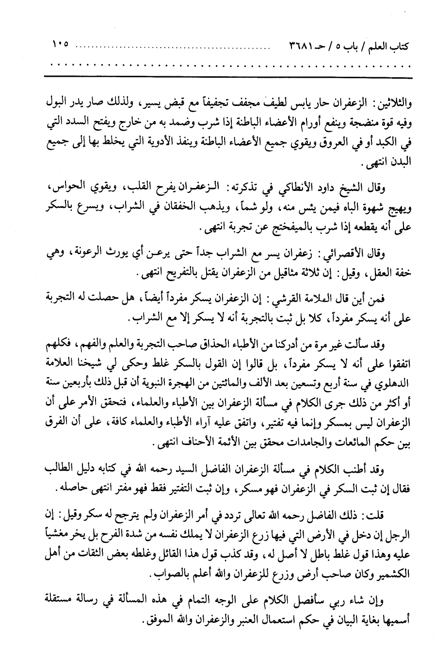 وَقَدْ أَطْنَبَ الْكَلَامَ فِي مَسْأَلَةِ الزَّعْفَرَانِ الْفَاضِلُ السَّيِّدُ رَحِمَهُ اللَّهُ فِي كِتَابِهِ دَلِيلُ الطَّالِبِ فَقَالَ إِنْ ثَبَتَ السُّكْرُ فِي الزَّعْفَرَانِ فَهُوَ مُسْكِرٌ وَإِنْ ثَبَتَ التَّفْتِيرُ فَقَطْ فَهُوَ مُفَتِّرٌ انْتَهَى حَاصِلُهُ
