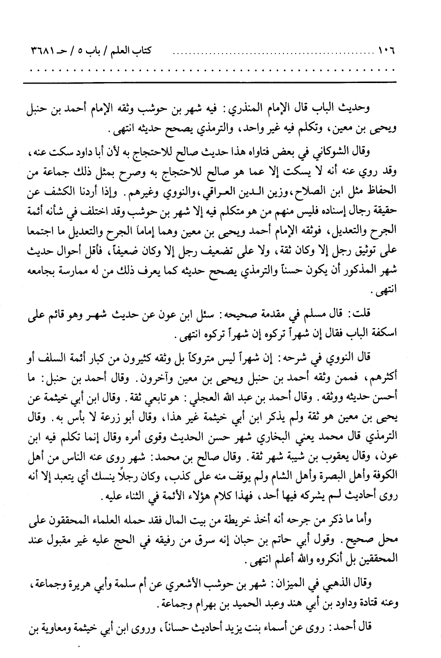 وَإِذَا أَرَدْنَا الْكَشْفَ عَنْ حَقِيقَةِ رِجَالِ إِسْنَادِهِ فَلَيْسَ مِنْهُمْ مَنْ هُوَ مُتَكَلَّمٌ فِيهِ إِلَّا شَهْرَ بْنَ حَوْشَبٍ وَقَدِ اخْتَلَفَ فِي شَأْنِهِ أَئِمَّةُ الْجَرْحِ وَالتَّعْدِيلِ فَوَثَّقَهُ الْإِمَامُ أَحْمَدُ وَيَحْيَى بْنُ مَعِينٍ وَهُمَا إِمَامَا الْجَرْحِ وَالتَّعْدِيلِ مَا اجْتَمَعَا عَلَى تَوْثِيقِ رَجُلٍ إِلَّا وَكَانَ ثِقَةً وَلَا عَلَى تَضْعِيفِ رَجُلٍ إِلَّا وَكَانَ ضَعِيفًا فَأَقَلُّ أَحْوَالِ حَدِيثِ شَهْرٍ الْمَذْكُورِ أَنْ يَكُونَ حَسَنًا وَالتِّرْمِذِيُّ يُصَحِّحُ حَدِيثَهُ كَمَا يَعْرِفُ ذَلِكَ مَنْ لَهُ مُمَارَسَةٌ بِجَامِعِهِ انْتَهَى