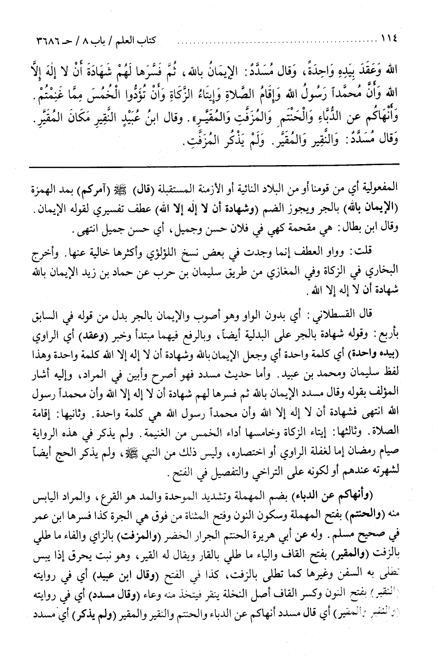 وَأَمَّا حَدِيثُ مُسَدَّدٍ فَهُوَ أَصْرَحُ وَأَبْيَنُ فِي الْمُرَادِ وَإِلَيْهِ أَشَارَ الْمُؤَلِّفُ بِقَوْلِهِ وَقَالَ مُسَدَّدٌ الْإِيمَانُ بِاللَّهِ ثُمَّ فَسَّرَهَا لَهُمْ شَهَادَةَ أَنْ لَا إِلَهَ إِلَّا اللَّهُ وَأَنَّ مُحَمَّدًا رسول الله انْتَهَى فَشَهَادَةُ أَنْ لَا إِلَهَ إِلَّا اللَّهُ وَأَنَّ مُحَمَّدًا رسول الله هِيَ كَلِمَةٌ وَاحِدَةٌ