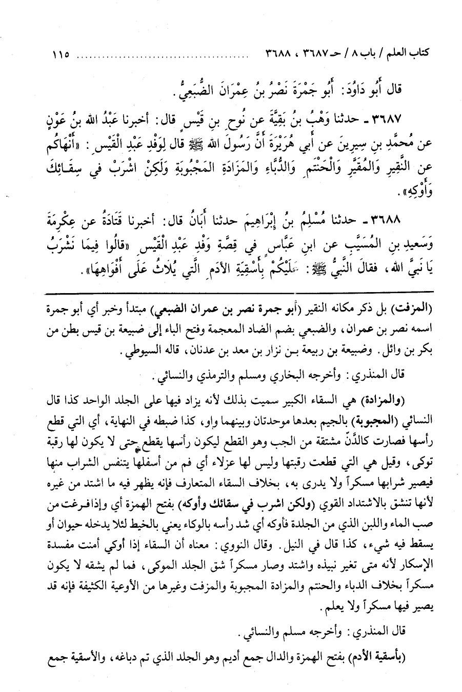 (الْمُزَفَّتَ) بَلْ ذَكَرَ مَكَانَهُ النَّقِيرَ (أَبُو جَمْرَةَ نَصْرُ بْنُ عِمْرَانَ الضُّبَعِيُّ) مُبْتَدَأٌ وَخَبَرٌ أَيْ أَبُو جَمْرَةَ اسْمُهُ نَصْرُ بْنُ عِمْرَانَ وَالضُّبَعِيُّ بِضَمِّ الضَّادِ الْمُعْجَمَةِ وَفَتْحِ الْبَاءِ إِلَى ضُبَيْعَةَ بْنِ قَيْسٍ بَطْنٍ مِنْ بَكْرِ بْنِ وَائِلٍ