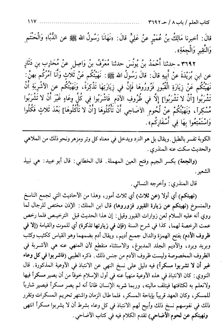 [3698] (نَهَيْتُكُمْ) أَيْ أَوَّلًا (عَنْ ثَلَاثٍ) أَيْ ثَلَاثِ أُمُورٍ وَهَذَا مِنَ الْأَحَادِيثِ الَّتِي تَجْمَعُ النَّاسِخَ وَالْمَنْسُوخَ (نَهَيْتُكُمْ عَنْ زيارة القبور فزوروها) قال بن الْمَلَكِ الْإِذْنُ مُخْتَصٌّ لِلرِّجَالِ لِمَا رُوِيَ أَنَّهُ عَلَيْهِ السَّلَامُ لَعَنَ زَوَّارَاتِ الْقُبُورِ وَقِيلَ إِنَّ هَذَا الْحَدِيثَ قَبْلَ التَّرْخِيصِ فَلَمَّا رَخَّصَ عَمَّتِ الرُّخْصَةُ لَهُمَا كَذَا فِي شَرْحِ السُّنَّةِ (فَإِنَّ في زيارتها تَذْكِرَةً) أَيْ لِلْمَوْتِ وَالْقِيَامَةِ (إِلَّا فِي ظُرُوفِ الْأَدَمِ) بِفَتْحِ الْهَمْزَةِ وَالدَّالِ جَمْعُ أَدِيمٍ وَيُقَالُ أُدُمٌ بَعْضُهُمَا وَهُوَ الْقِيَاسُ كَكَثِيبٍ وَكُثُبٍ وَبَرِيدٍ وَبُرُدٍ وَالْأَدِيمُ الْجِلْدُ الْمَدْبُوغُ وَالِاسْتِثْنَاءُ مُنْقَطِعٌ لِأَنَّ الْمَنْهِيَّ عَنْهُ هِيَ الْأَشْرِبَةُ فِي الظُّرُوفِ الْمَخْصُوصَةِ وَلَيْسَتْ ظُرُوفُ الْأَدَمِ مِنْ جِنْسِ ذَلِكَ