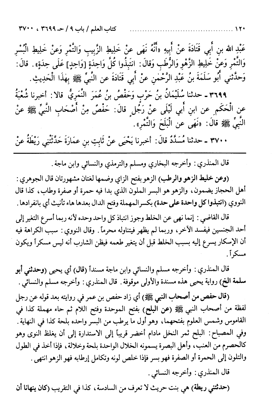 [3705] (قَالَ حَفْصٌ مِنْ أَصْحَابِ النَّبِيِّ صَلَّى اللَّهُ عَلَيْهِ وَسَلَّمَ) أَيْ زَادَ حَفْصُ بْنُ عُمَرَ فِي رِوَايَتِهِ بَعْدَ قَوْلِهِ عَنْ رَجُلٍ لَفْظَةَ مِنْ أَصْحَابِ النَّبِيِّ صَلَّى اللَّهُ عَلَيْهِ وَسَلَّمَ (عَنِ الْبَلَحِ) بِفَتْحِ الْمُوَحَّدَةِ وَفَتْحِ اللَّامِ ثُمَّ حَاءٍ مُهْمَلَةٍ كَذَا فِي الْقَامُوسِ وَشَمْسِ الْعُلُومِ بِفَتْحِهِمَا وَهُوَ أَوَّلُ مَا يَرْطُبُ مِنَ الْبُسْرِ وَاحِدُهُ بَلَحَةٌ كَذَا فِي النِّهَايَةِ