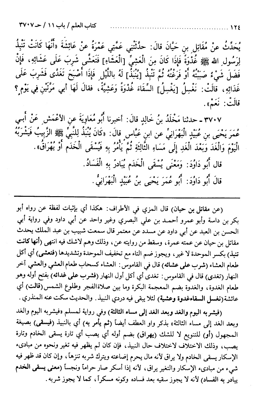 [3712] (عَنْ مُقَاتِلِ بْنِ حَيَّانَ) قَالَ الْمِزِّيُّ فِي الْأَطْرَافِ هَكَذَا أَيْ بِإِثْبَاتِ لَفْظَةِ عَنْ رَوَاهُ أَبُو بَكْرِ بْنُ دَاسَةَ وَأَبُو عَمْرٍو وَأَحْمَدُ بْنُ عَلِيٍّ الْبَصْرِيُّ وَغَيْرُ وَاحِدٍ عَنْ أَبِي دَاوُدَ وَفِي رِوَايَةِ أَبِي الْحَسَنِ بْنِ الْعَبْدِ عَنْ أَبِي دَاوُدَ عَنْ مُسَدَّدٍ عَنْ مُعْتَمِرٍ قَالَ سَمِعْتُ شَبِيبَ بْنَ عَبْدِ الْمَلِكِ يُحَدِّثُ مُقَاتِلَ بْنَ حَيَّانَ عَنْ عَمَّتِهِ عَمْرَةَ وَسَقَطَ من روايته عن وذلك وهم لاشك فِيهِ انْتَهَى (أَنَّهَا كَانَتْ تَنْبِذُ) بِكَسْرِ الْمُوَحَّدَةِ لَا غَيْرَ وَيَجُوزُ ضَمُّ التَّاءِ مَعَ تَخْفِيفِ الْمُوَحَّدَةِ وَتَشْدِيدِهَا (فَتَعَشَّى) أَيْ أَكَلَ طَعَامَ الْعَشَاءِ (شَرِبَ عَلَى عَشَائِهِ) قَالَ فِي الْقَامُوسِ الْعَشَاءُ كَسَحَابٍ طَعَامُ الْعَشِيِّ وَالْعَشِيُّ آخِرُ النَّهَارِ (تَغَدَّى) قَالَ فِي الْقَامُوسِ تَغَدَّى أَيْ أَكَلَ أَوَّلَ النَّهَارِ (فَشَرِبَ عَلَى غَدَائِهِ) بِفَتْحِ أَوَّلِهِ وَهُوَ طَعَامُ الْغُدْوَةِ وَالْغُدْوَةُ بِضَمِّ الْمُعْجَمَةِ الْبُكْرَةُ وَمَا بَيْنَ صَلَاةِ الْفَجْرِ وَطُلُوعِ الشَّمْسِ (قَالَتْ) أَيْ عَائِشَةُ (تَغْسِلُ السِّقَاءَ غُدْوَةً وَعَشِيَّةً) لِئَلَّا يَبْقَى فِيهِ دُرْدِيُّ النَّبِيذِ