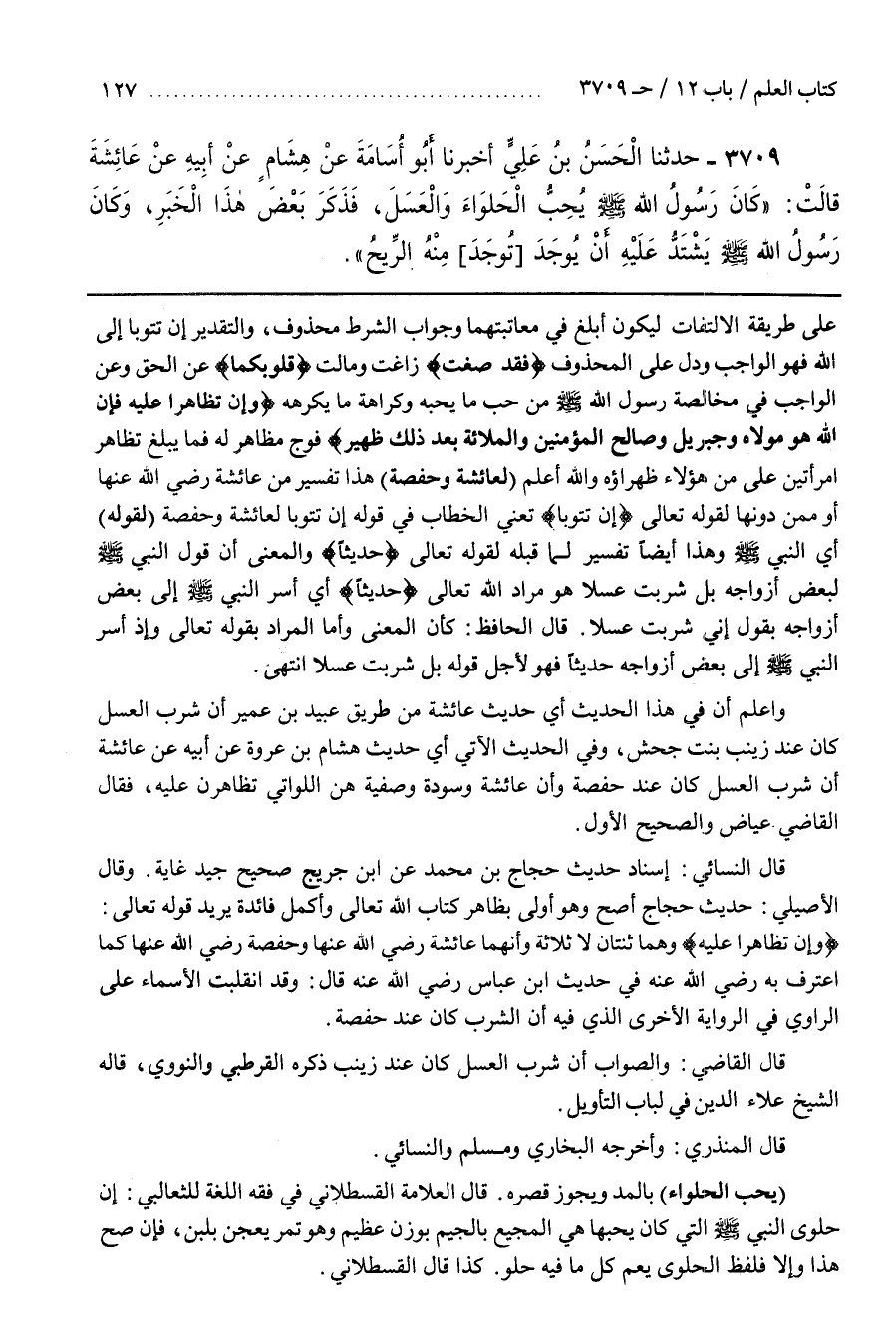 وَاعْلَمْ أَنَّ فِي هَذَا الْحَدِيثِ أَيْ حَدِيثِ عَائِشَةَ مِنْ طَرِيقِ عُبَيْدِ بْنِ عُمَيْرٍ أَنَّ شُرْبَ الْعَسَلِ كَانَ عِنْدَ زَيْنَبَ بِنْتِ جَحْشٍ وَفِي الْحَدِيثِ الْآتِي أَيْ حَدِيثِ هِشَامِ بْنِ عُرْوَةَ عَنْ أَبِيهِ عَنْ عَائِشَةَ أَنَّ شُرْبَ الْعَسَلِ كَانَ عِنْدَ حَفْصَةَ وَأَنَّ عَائِشَةَ وَسَوْدَةَ وَصَفِيَّةَ هُنَّ اللَّوَاتِي تَظَاهَرْنَ عَلَيْهِ فَقَالَ الْقَاضِي عِيَاضٌ وَالصَّحِيحُ الْأَوَّلُ