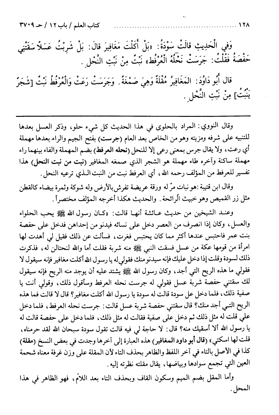 وَعِنْدَ الشَّيْخَيْنِ مِنْ حَدِيثِ عَائِشَةَ أَنَّهَا قَالَتْ كَانَ رَسُولُ اللَّهِ صَلَّى اللَّهُ عَلَيْهِ وَسَلَّمَ يُحِبُّ الْحَلْوَاءَ وَالْعَسَلَ وَكَانَ إِذَا انْصَرَفَ مِنَ الْعَصْرِ دَخَلَ عَلَى نِسَائِهِ فَيَدْنُو مِنْ إِحْدَاهُنَّ فَدَخَلَ عَلَى حَفْصَةَ بِنْتِ عُمَرَ فَاحْتَبَسَ عِنْدَهَا أَكْثَرَ مِمَّا كَانَ يَحْتَبِسُ فَغِرْتُ فَسَأَلْتُ عَنْ ذَلِكَ فَقِيلَ لِي أَهْدَتْ لَهَا امْرَأَةٌ مِنْ قَوْمِهَا عُكَّةً مِنْ عَسَلٍ فَسَقَتِ النَّبِيَّ صَلَّى اللَّهُ عَلَيْهِ وَسَلَّمَ مِنْهُ شَرْبَةً فَقُلْتُ أَمَا وَاللَّهِ لَنَحْتَالَنَّ لَهُ فَذَكَرْتُ ذَلِكَ لِسَوْدَةَ وَقُلْتُ إِذَا دَخَلَ عَلَيْكِ فإنه سيدنو منك فقولي له يارسول اللَّهِ أَكَلْتَ مَغَافِيرَ فَإِنَّهُ سَيَقُولُ لَا فَقُولِي مَا هَذِهِ الرِّيحُ الَّتِي أَجِدُ وَكَانَ رَسُولُ اللَّهِ صَلَّى اللَّهُ عَلَيْهِ وَسَلَّمَ يَشْتَدُّ عَلَيْهِ أَنْ يُوجَدَ مِنْهُ الرِّيحُ فَإِنَّهُ سَيَقُولُ لَكِ سَقَتْنِي حَفْصَةُ شَرْبَةَ عَسَلٍ فَقُولِي لَهُ جَرَسَتْ نحله العرفط وسأقول ذلك وقولي أنت ياصفية ذَلِكَ فَلَمَّا دَخَلَ عَلَى سَوْدَةَ قَالَتْ لَهُ سَوْدَةُ يَا رَسُولَ اللَّهِ أَكَلْتَ مَغَافِيرَ قَالَ لَا قَالَتْ فَمَا هَذِهِ الرِّيحُ الَّتِي أَجِدُ مِنْكَ قَالَ سَقَتْنِي حَفْصَةُ شَرْبَةَ عَسَلٍ قَالَتْ جَرَسَتْ نَحْلُهُ الْعُرْفُطَ فَلَمَّا دَخَلَ عَلَيَّ قُلْتُ لَهُ مِثْلَ ذَلِكَ ثُمَّ دَخَلَ عَلَى صَفِيَّةَ فَقَالَتْ لَهُ مِثْلَ ذَلِكَ فَلَمَّا دَخَلَ عَلَى حفصة قالت له يارسول اللَّهِ أَلَا أَسْقِيكَ مِنْهُ قَالَ لَا حَاجَةَ لِي فِيهِ قَالَتْ تَقُولُ سَوْدَةُ سُبْحَانَ اللَّهِ لَقَدْ حَرَمْنَاهُ قُلْتُ لَهَا اسْكُتِي (قَالَ أَبُو دَاوُدَ الْمَغَافِيرُ) هَذِهِ الْعِبَارَةُ إِلَى آخِرِهَا وُجِدَتْ فِي بَعْضِ النُّسَخِ (مُقْلَةٌ) كَذَا فِي الْأَصْلِ بِالتَّاءِ فِي آخِرِ اللَّفْظِ وَالظَّاهِرُ بِحَذْفِ التَّاءِ لِأَنَّ الْمُقْلَةَ عَلَى وَزْنِ غُرْفَةٍ مَعْنَاهُ شَحْمَةُ الْعَيْنِ الَّتِي تَجْمَعُ سَوَادَهَا وَبَيَاضَهَا يُقَالُ مَقَلْتُهُ نظرته إِلَيْهِ