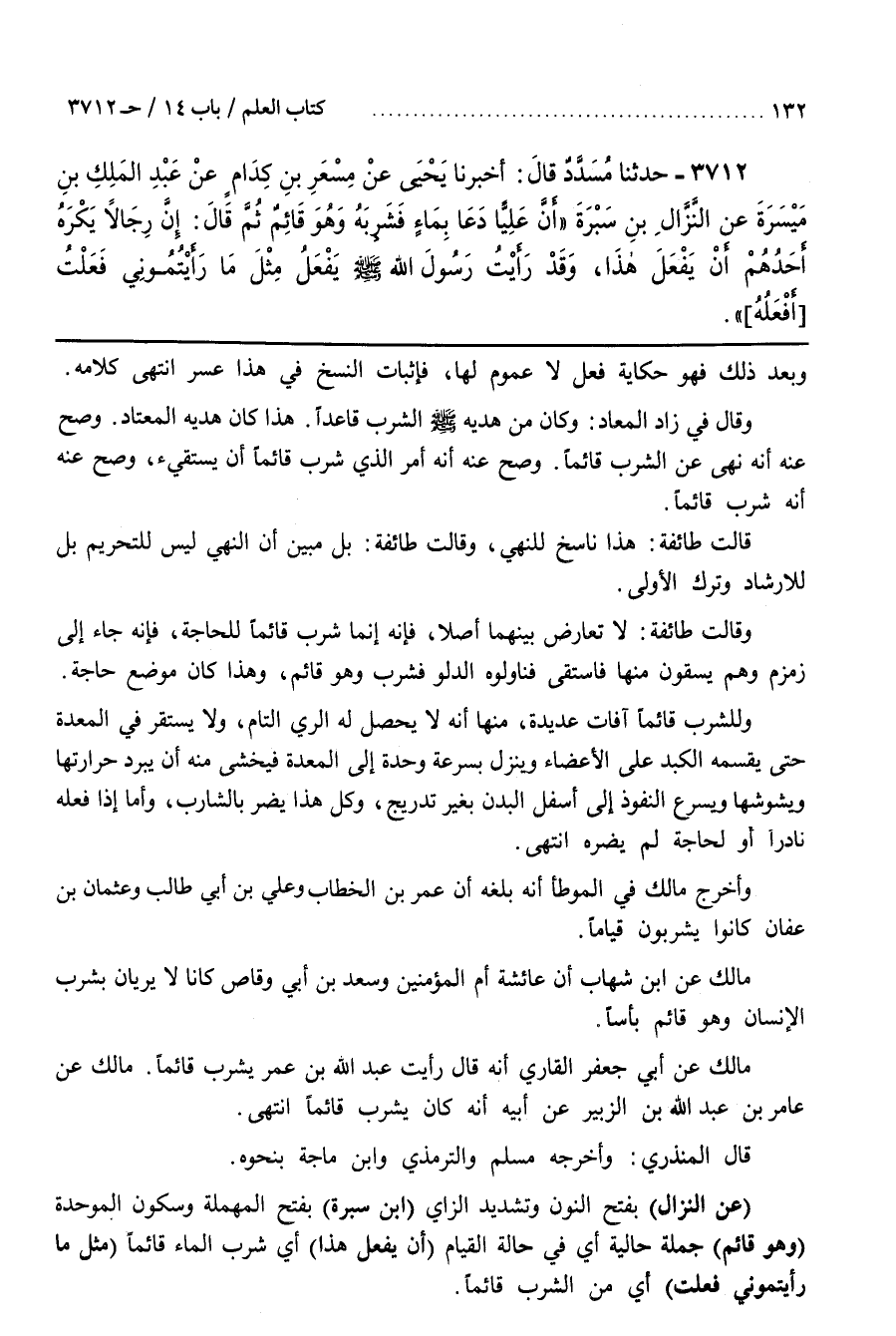 [3718] (عَنِ النَّزَّالِ) بِفَتْحِ النُّونِ وَتَشْدِيدِ الزاي (بن سَبْرَةَ) بِفَتْحِ الْمُهْمَلَةِ وَسُكُونِ الْمُوَحَّدَةِ (وَهُوَ قَائِمٌ) جُمْلَةٌ حَالِيَّةٌ أَيْ فِي حَالَةِ الْقِيَامِ (أَنْ يَفْعَلَ هَذَا) أَيْ شُرْبَ الْمَاءِ قَائِمًا (مِثْلَ مَا رَأَيْتُمُونِي فَعَلْتُ) أَيْ مِنَ الشُّرْبِ قَائِمًا