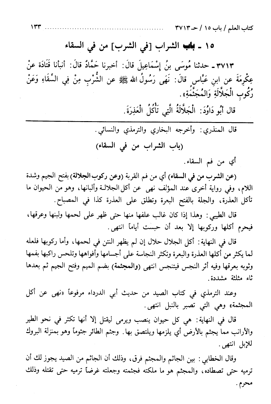 [3719] (عَنِ الشُّرْبِ مِنْ فِي السِّقَاءِ) أَيْ مِنْ فَمِ الْقِرْبَةِ (وَعَنْ رُكُوبِ الْجَلَّالَةِ) بِفَتْحِ الْجِيمِ وَشَدَّةِ اللَّامِ وَفِي رِوَايَةٍ أُخْرَى عِنْدَ الْمُؤَلِّفِ نَهَى عَنْ أَكْلِ الْجَلَّالَةِ وَأَلْبَانِهَا وَهُوَ مِنَ الْحَيَوَانِ مَا تَأْكُلُ الْعَذِرَةَ